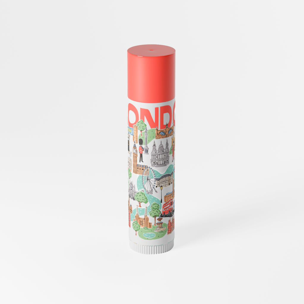 Front view of a stick lip balm in bright yellow card packaging, featuring an orange cat illustration and a light blue lip balm tube with a purple cap. The tube is decorated with white and grey cats and fish bones, with visible text indicating coconut flavour, cruelty-free, and vegan.