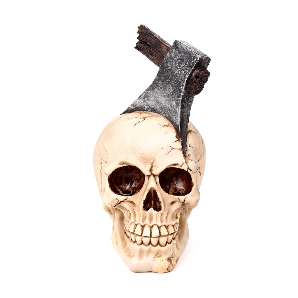 Angled view of a decorative, bone-coloured skull ornament with a gold-hilted sword piercing the top and emerging from the eye socket.