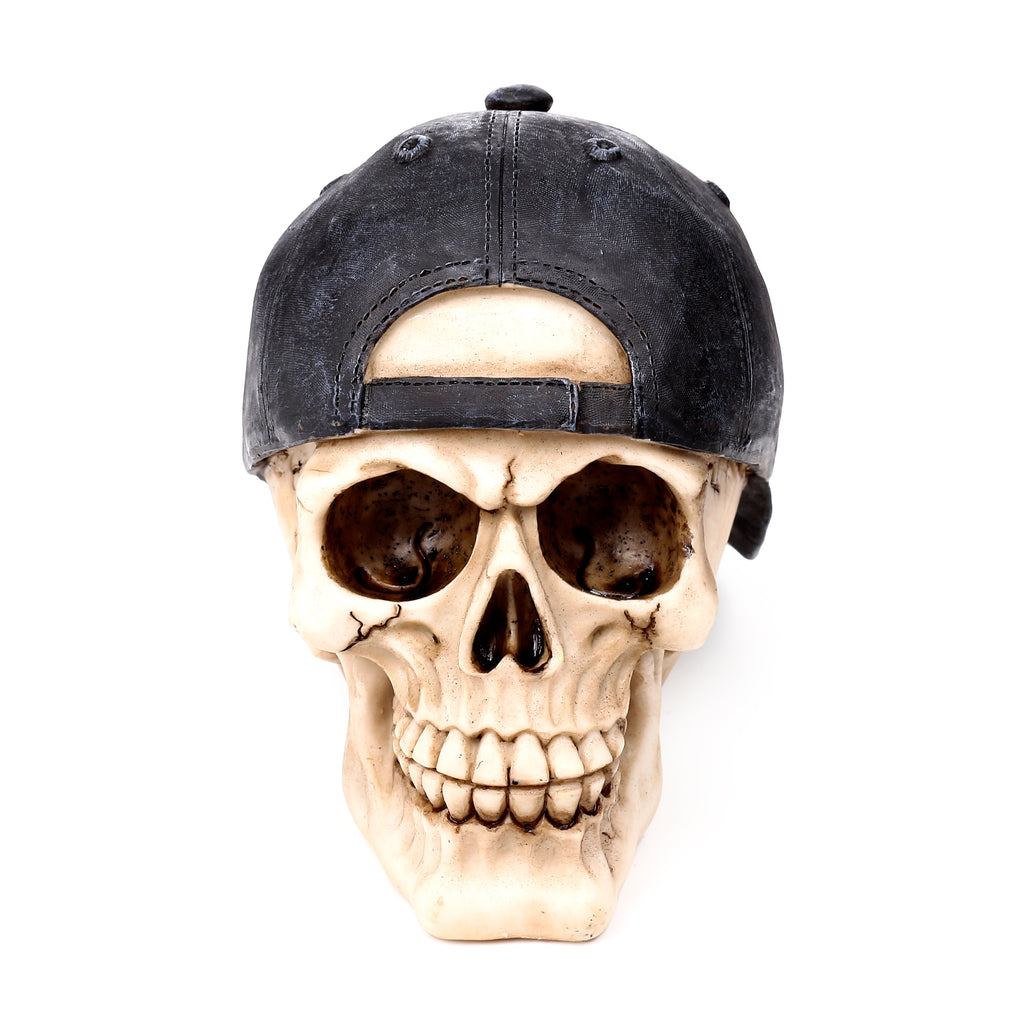 Front view of a decorative bone-coloured punk skull ornament featuring a metallic bladed mohican and dark chains draped across its head.