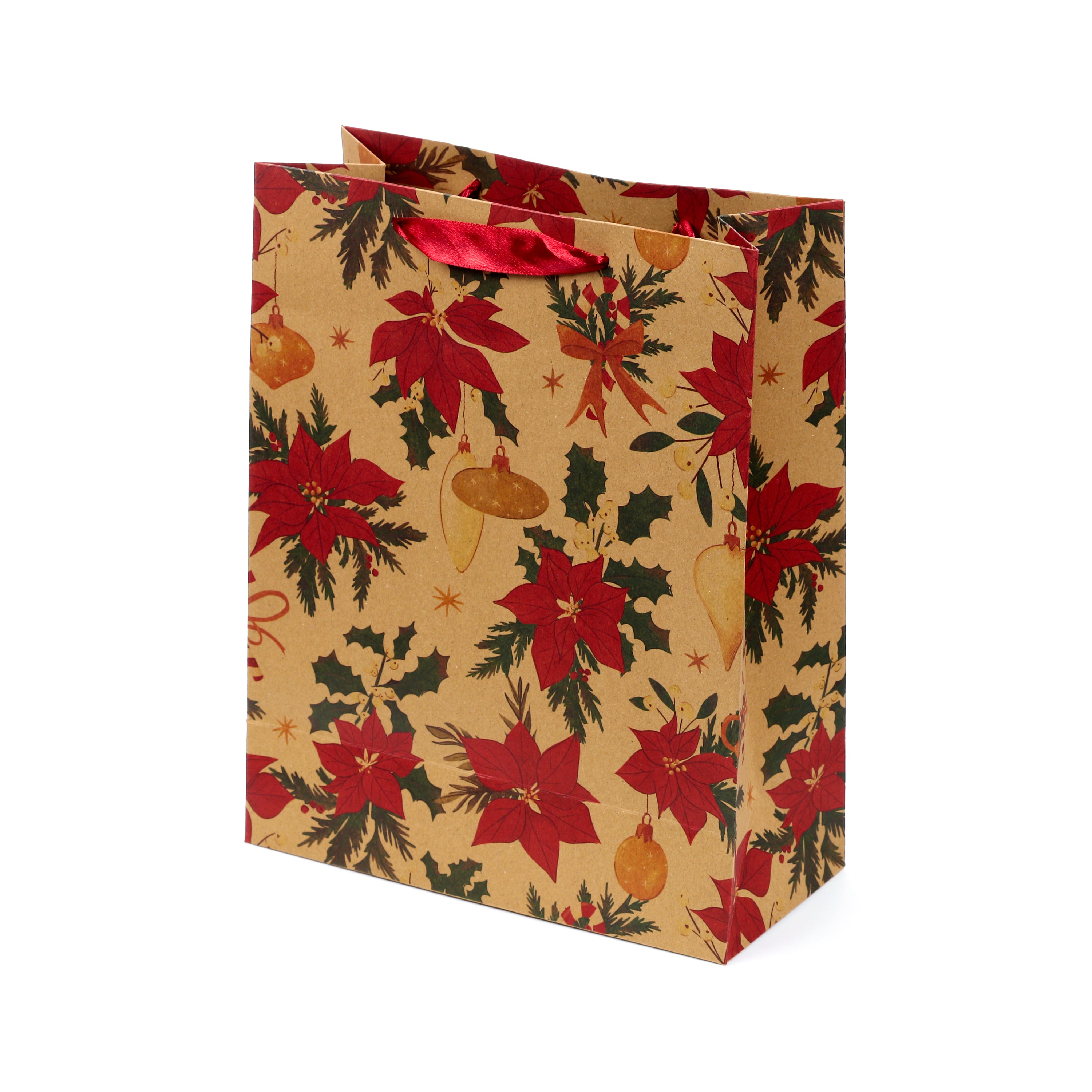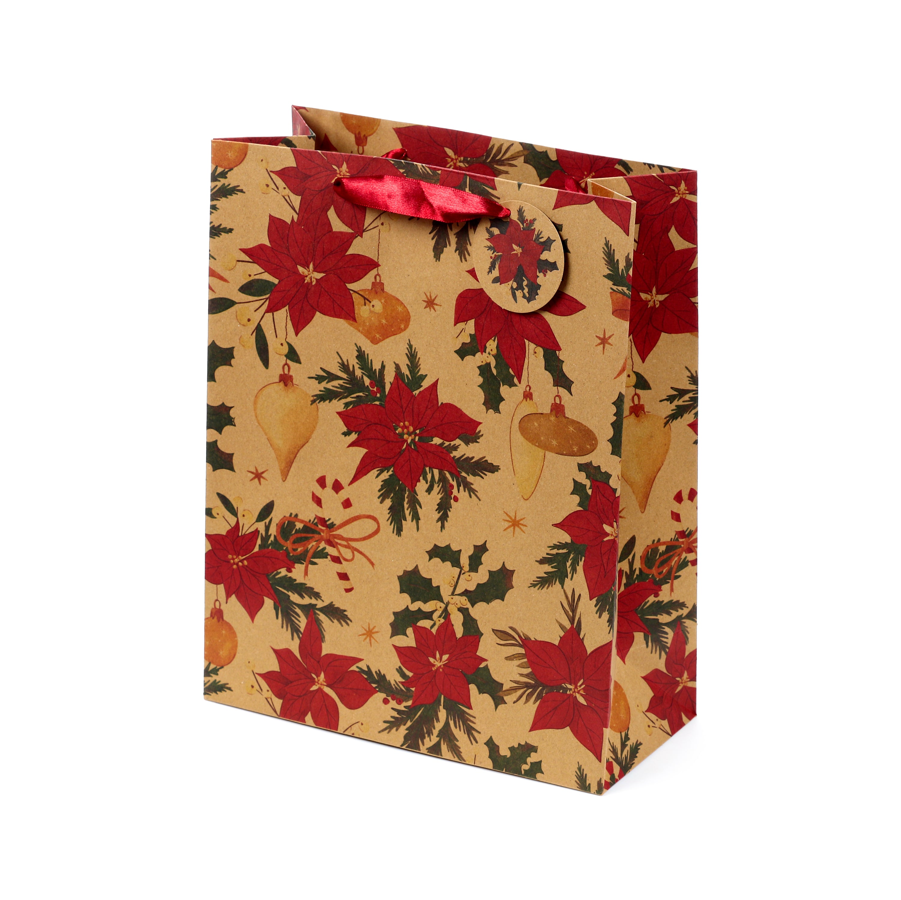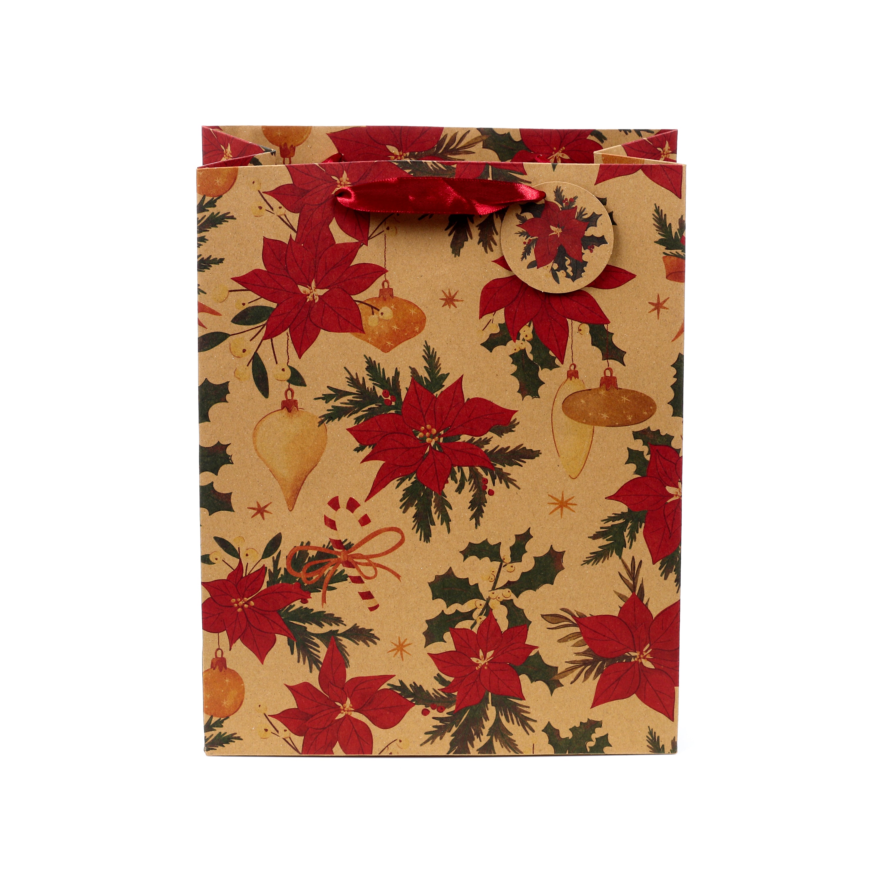Stunning Botanical Design: Adorned with a delightful array of traditional Christmas botanicals, including vibrant red poinsettias, classic green holly, delicate pine sprigs, shimmering gold baubles, and playful candy canes, this bag brings the beauty of the season right to your doorstep.