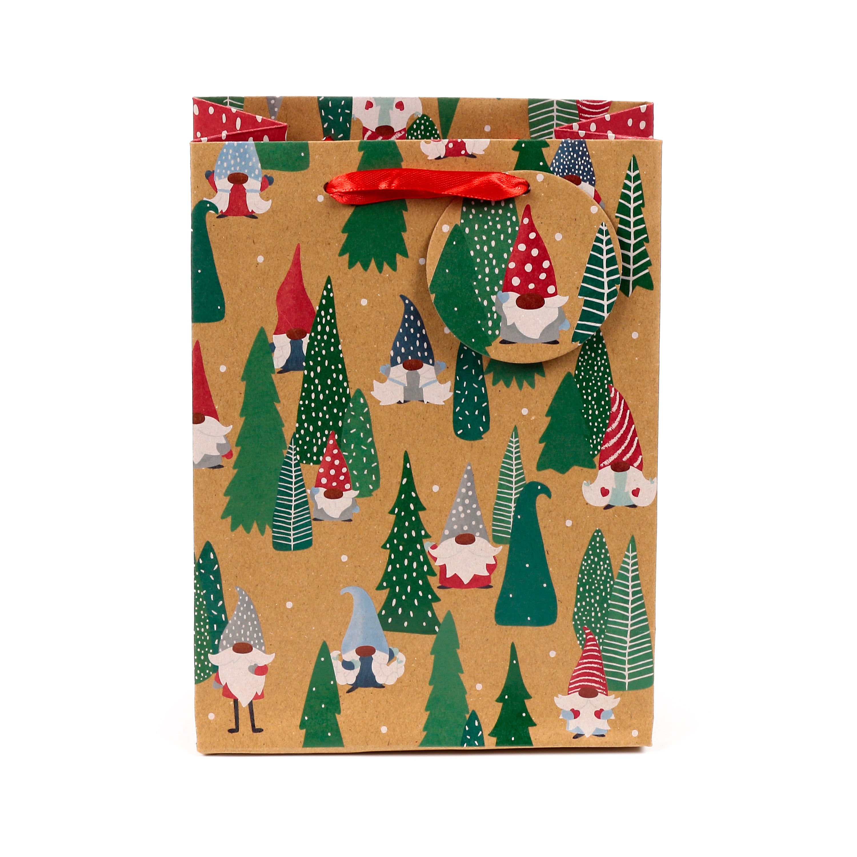 Whimsical Gonk Design: Adorned with a festive pattern of jolly gonks, classic green Christmas trees, and whimsical white snow against a natural kraft paper background, this bag is a charming visual treat that captures the heart of Christmas.