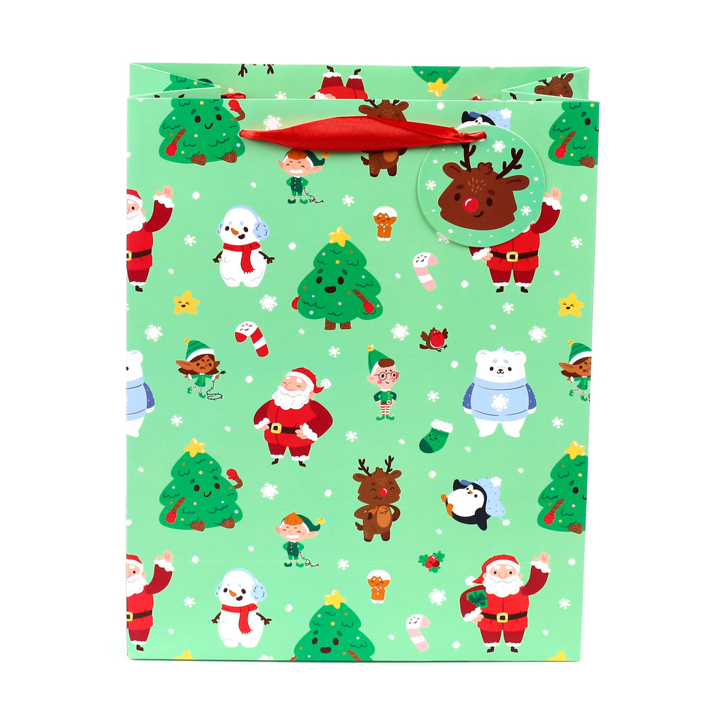 Front view of a magnetic bookmark set featuring four Christmas characters: Santa Claus, a snowman, an elf, and a reindeer, displayed on a festive green backing card.