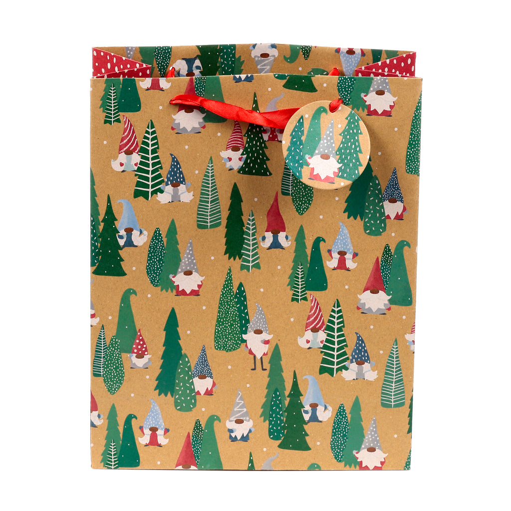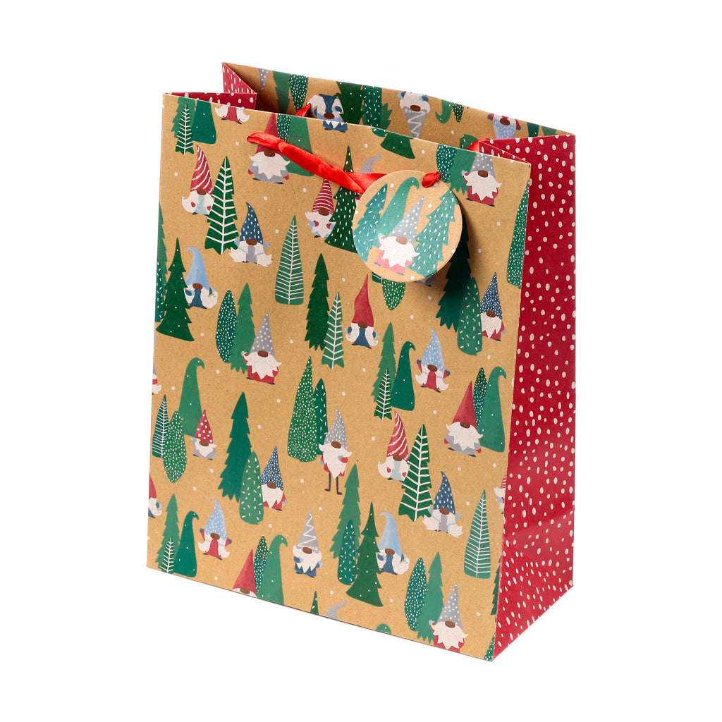 Angled view of a large white Christmas gift bag with red sides and red ribbon handles. The front features an illustration of a Highland Coo wearing a red Santa hat and holding green holly, surrounded by scattered holly leaves and red berries.