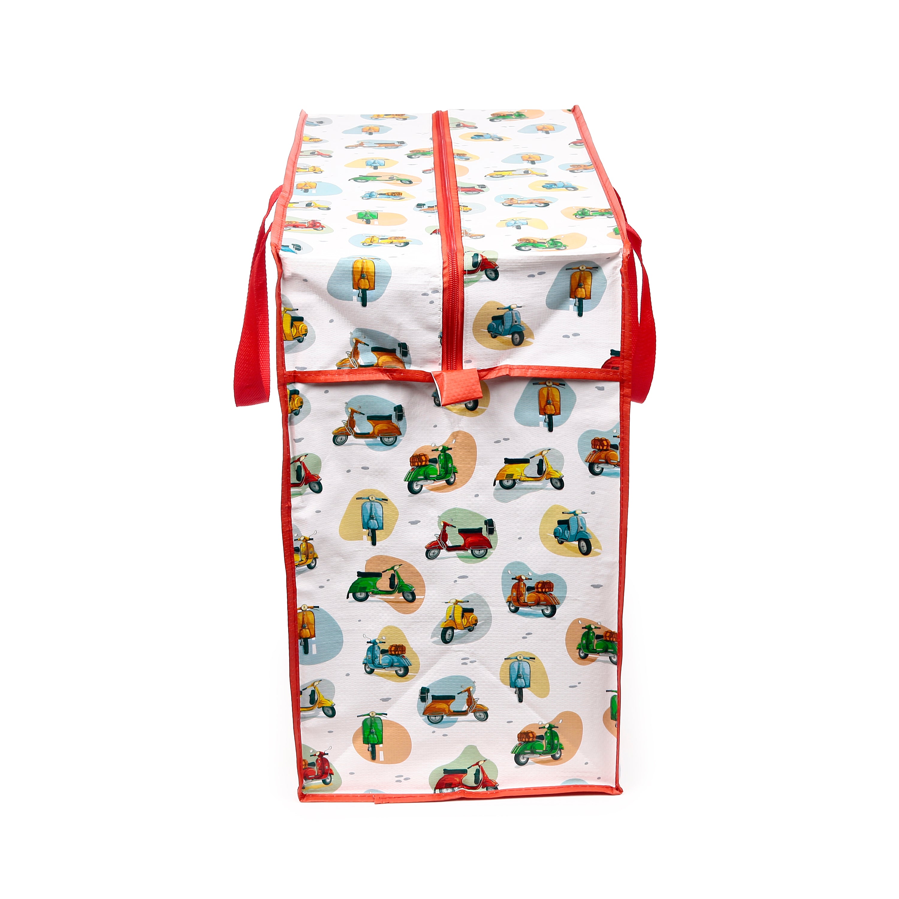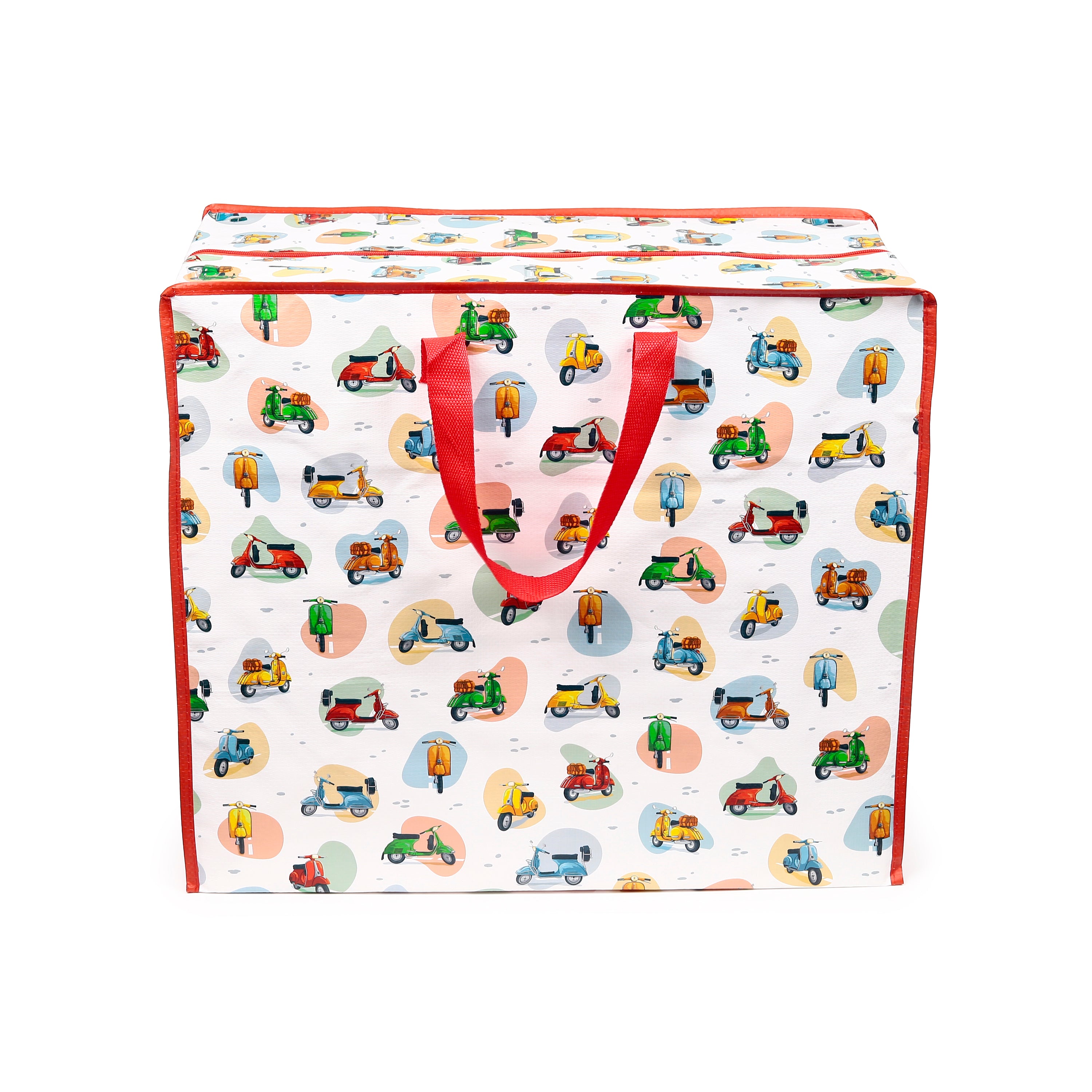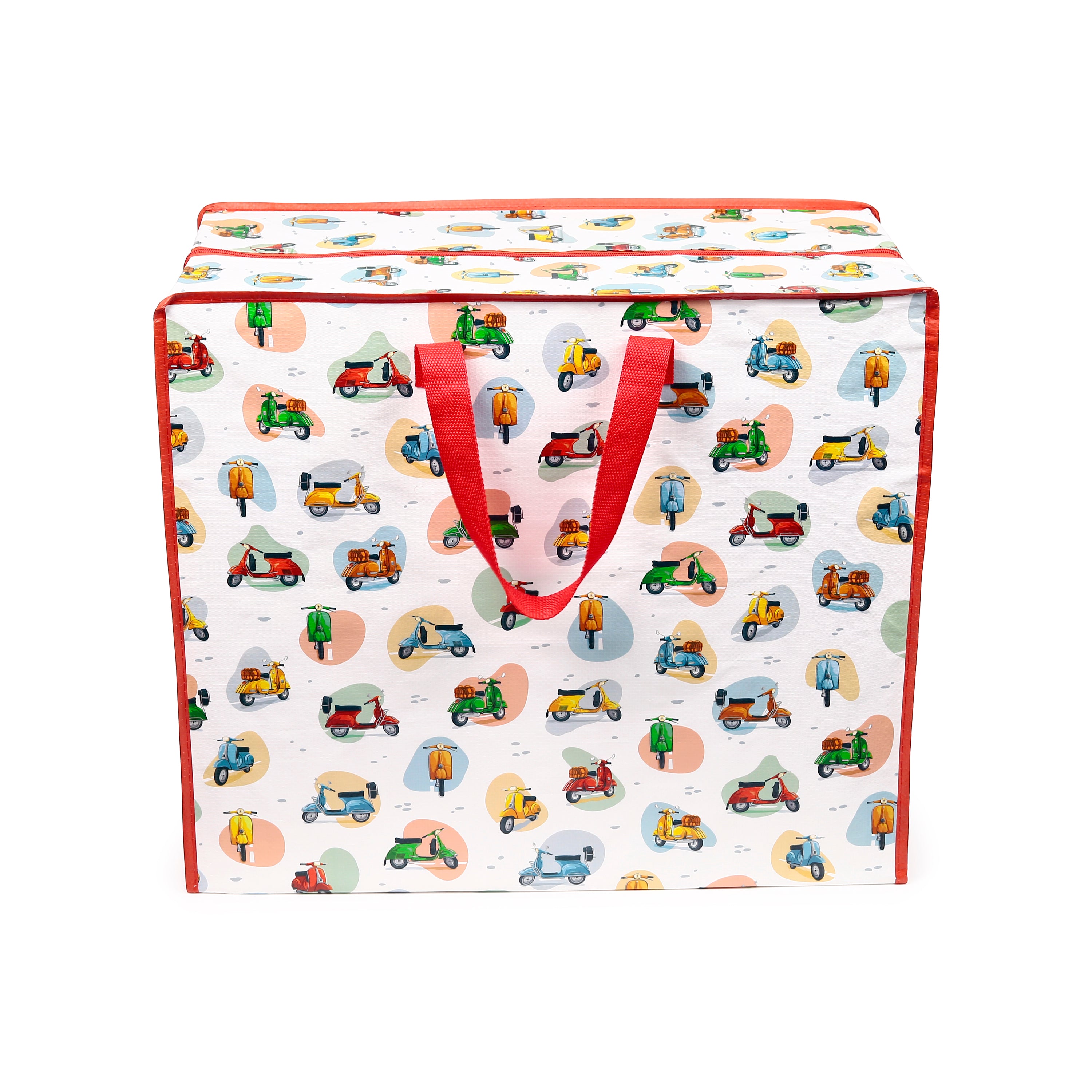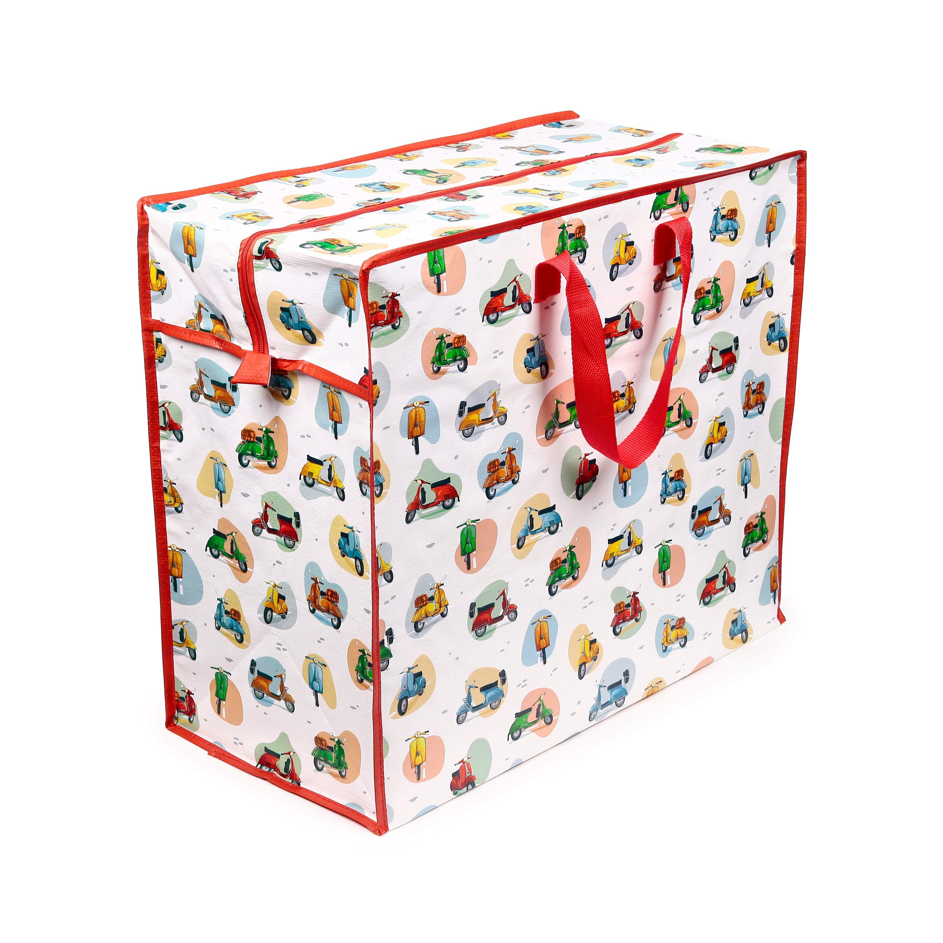Charming Scooter Design: Adorned with a colourful scooter pattern, complemented by bright red trim and sturdy red fabric handles, this bag brings a pop of joy to any room and adds a playful touch to storage solutions.