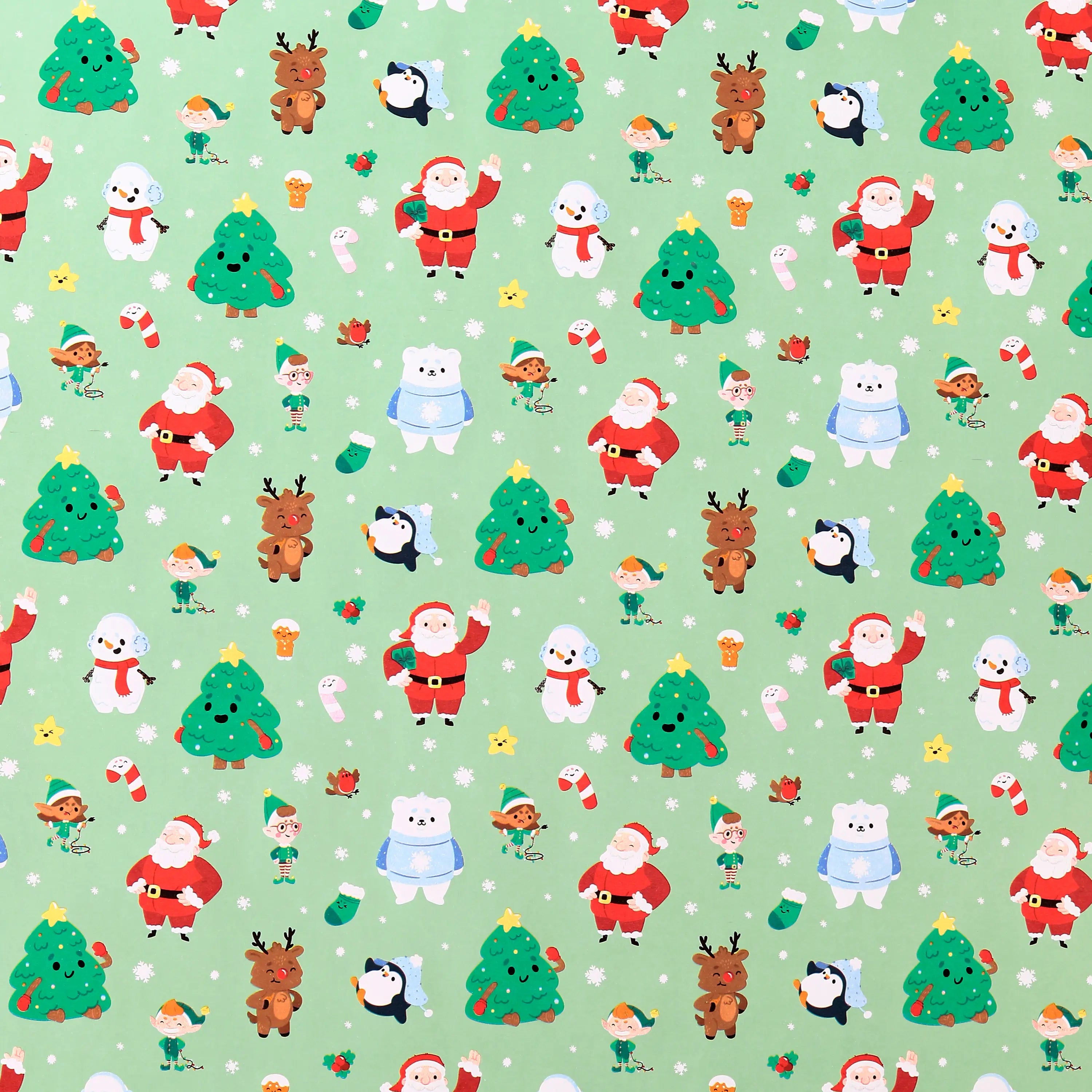 Whimsical 'Jingle Bunch' Design: Adorned with a lively, repeating pattern of cheerful cartoon Santa Claus, playful elves, friendly reindeer, jolly snowmen, adorable penguins, and charming polar bears, all nestled amongst twinkling Christmas trees, delicate snowflakes, tempting candy canes, and festive holly on a vibrant light green background.