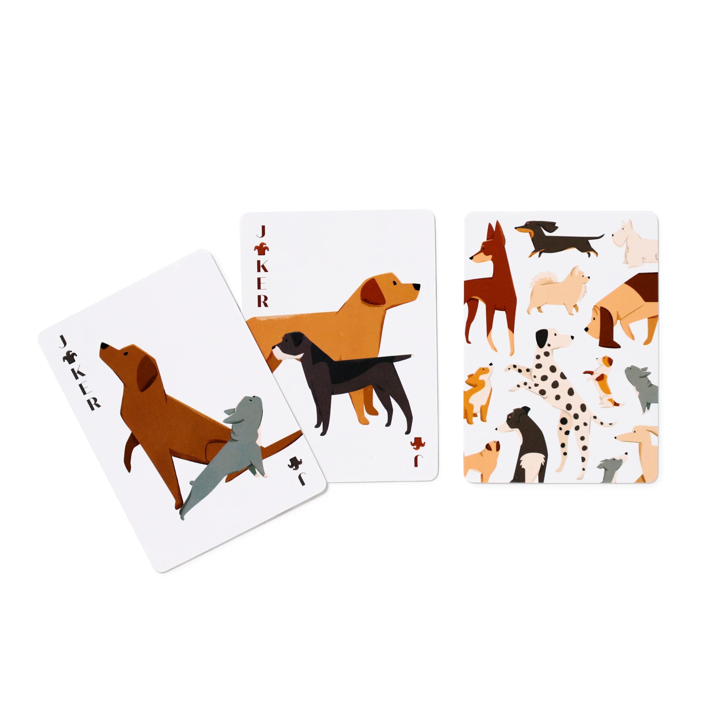 Whimsical Canine Art: Experience a unique standard deck where each card features an adorable, stylised illustration of a different dog breed. The Spades suit, for instance, showcases a fluffy Pomeranian on the Ace, a sleek greyhound on the King, a charming dachshund on the Queen, and a majestic husky on the Jack. You'll find a lively pug, a spotted dalmatian, and many more canine companions across the Hearts, Clubs, and Diamonds suits, alongside uniquely illustrated Joker cards featuring both large and small dogs.