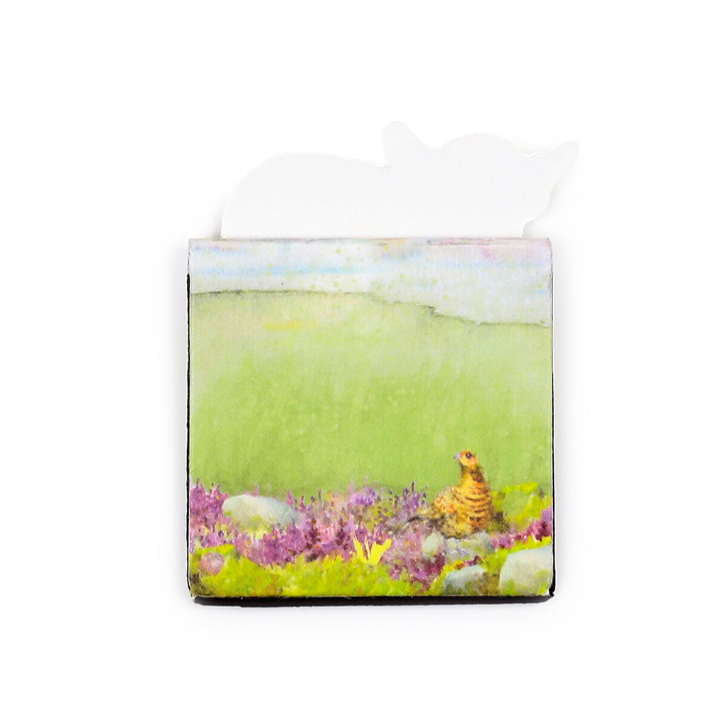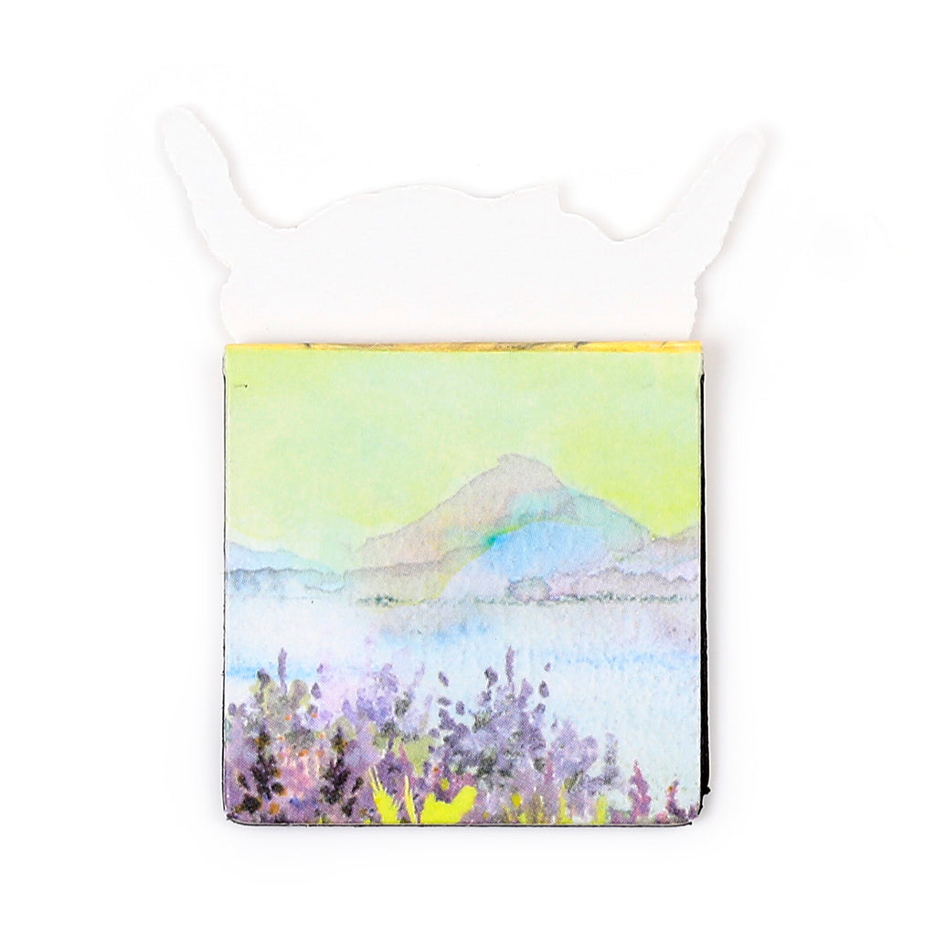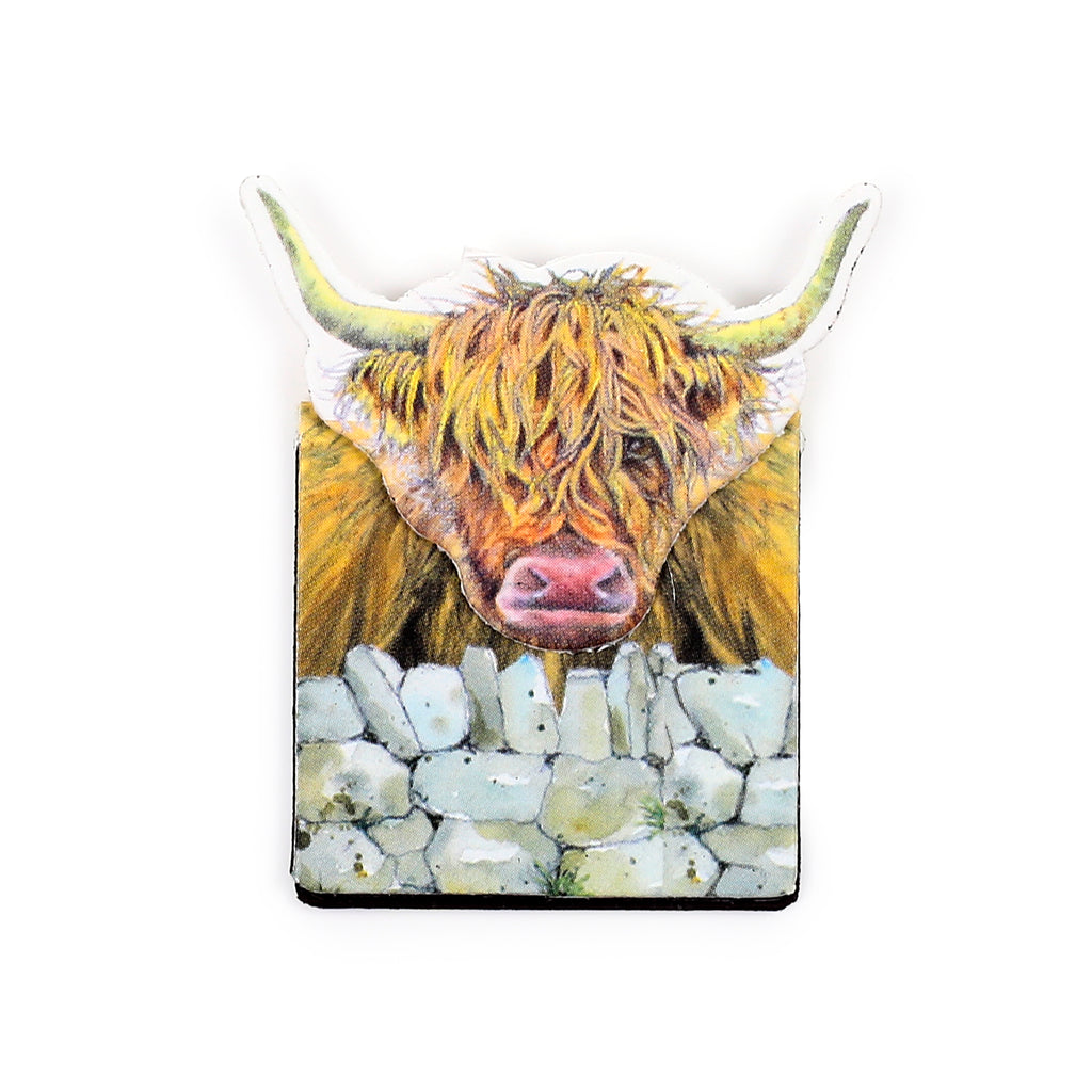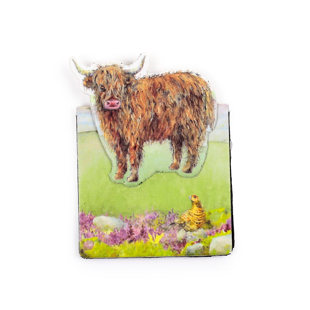 Artistic Allure: Each of the four magnetic bookmarks showcases a unique, beautifully rendered watercolour illustration by Jan Pashley, capturing the serene spirit of the Highland Coo. You'll find two endearing close-up Highland cow faces peeking over a stone wall, and two full Highland cow bodies depicted within a picturesque heather landscape, one even accompanied by a sweet little bird.