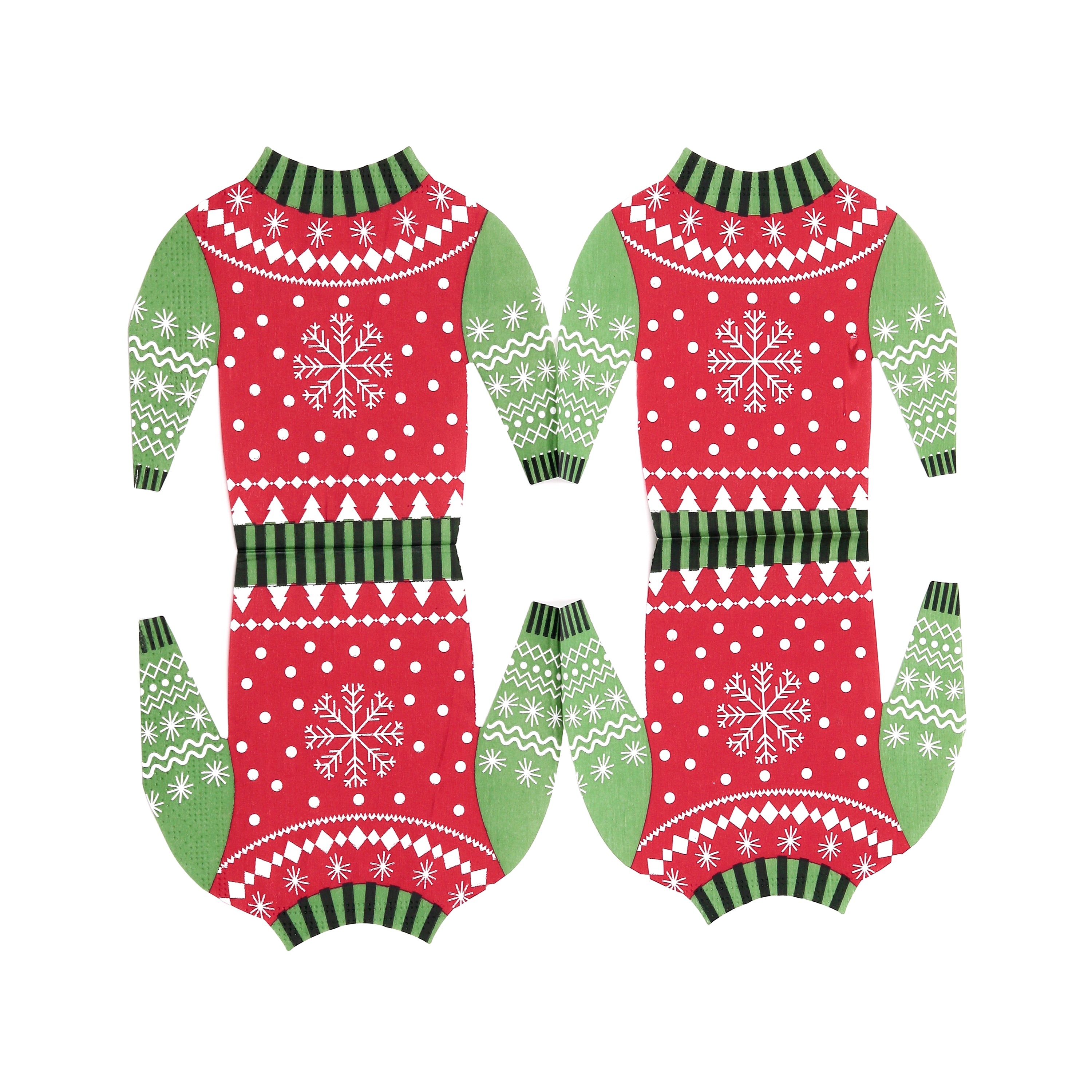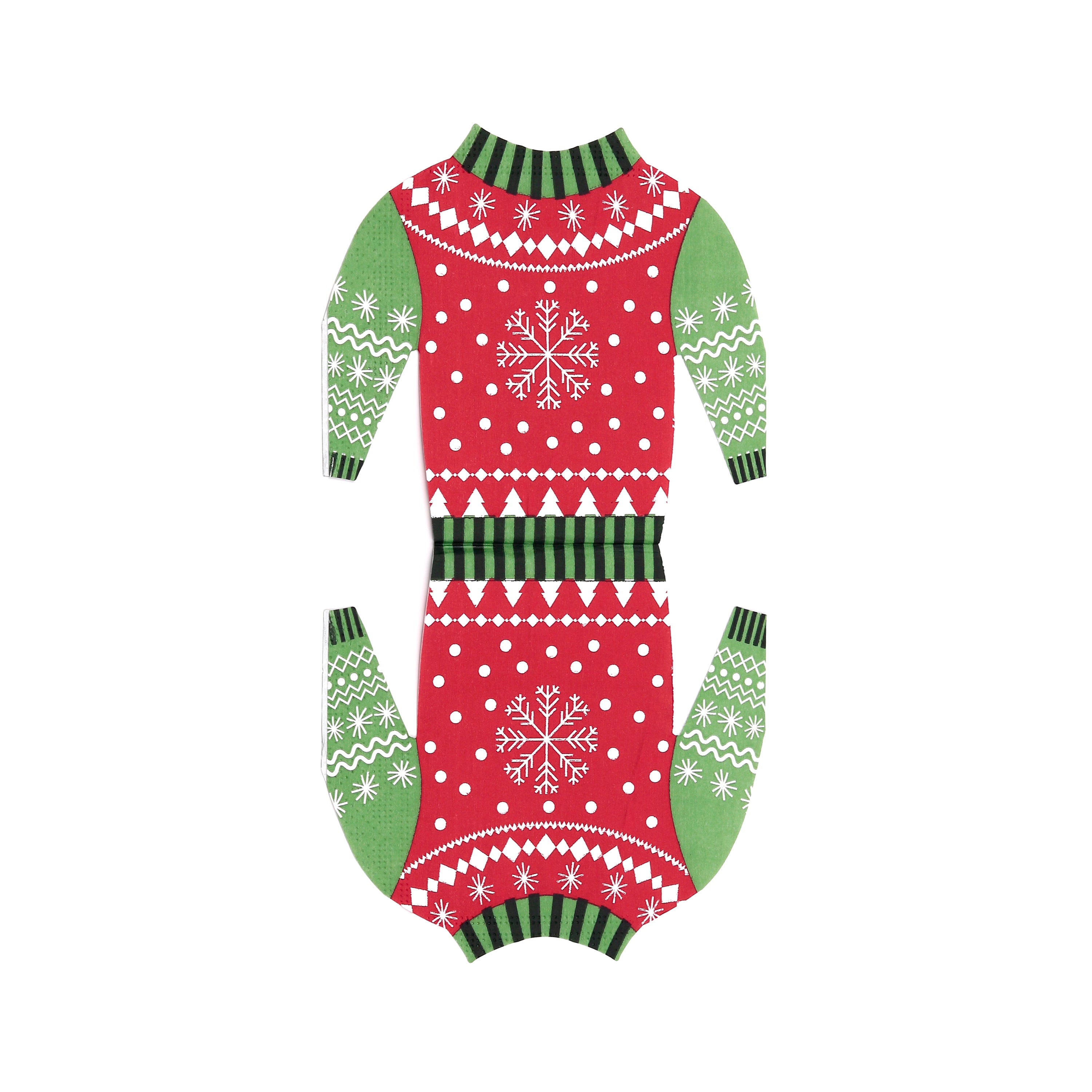 Unique Festive Design: Each napkin is a celebration of Christmas spirit, crafted in the distinctive shape of a cosy jumper. Adorned with a prominent white snowflake, charming polka dots, intricate diamond patterns, playful zig-zags, and classic stripes, all presented in a vibrant red and green colour palette for an unmistakably festive touch.