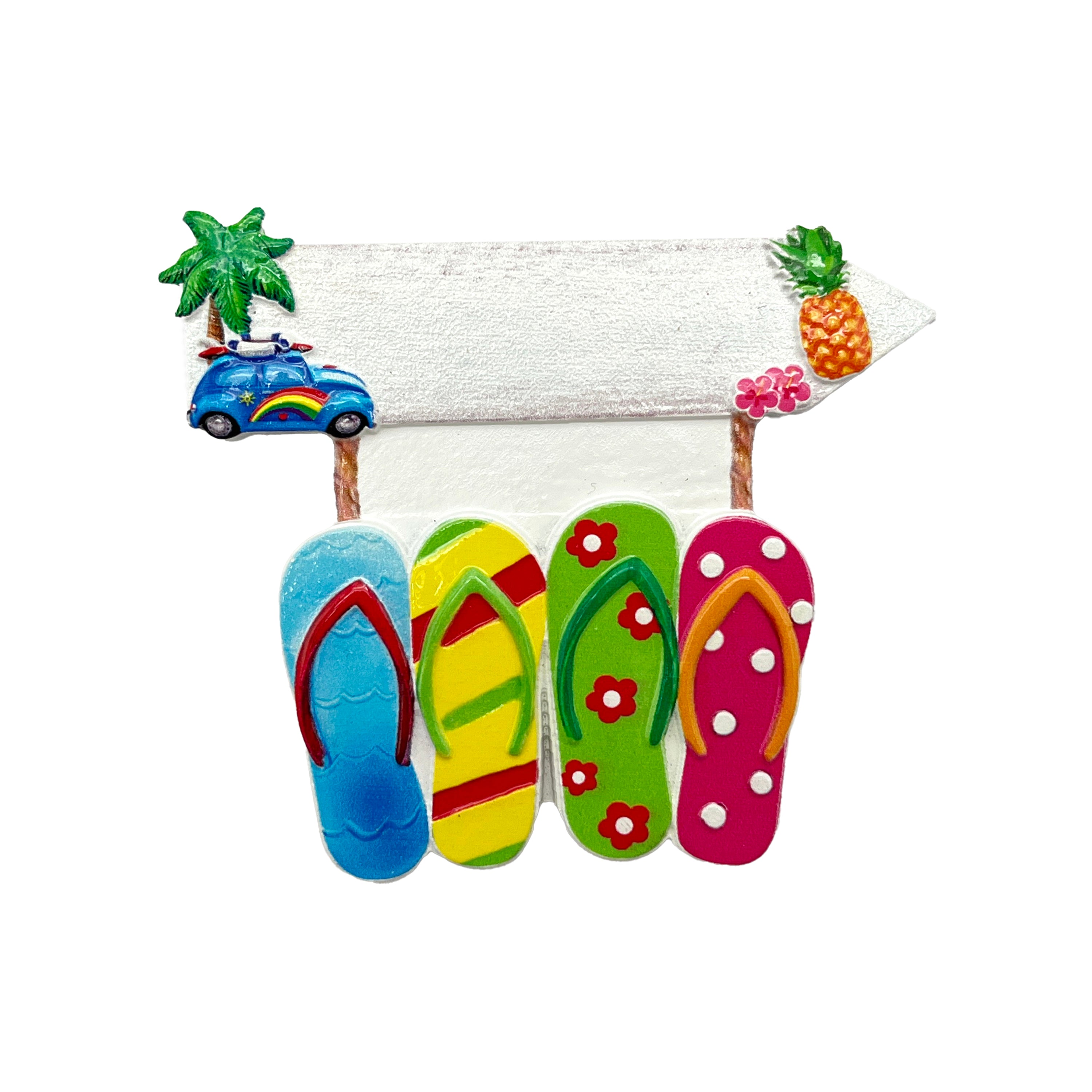 Tropical Scene: Adorn your fridge with a miniature slice of holiday bliss, featuring a detailed white sign complete with a swaying palm tree, a classic blue car, a juicy pineapple, and delicate pink flowers. Below, four vividly coloured flip-flops in blue, yellow, green, and pink dangle playfully, adding movement and joy.