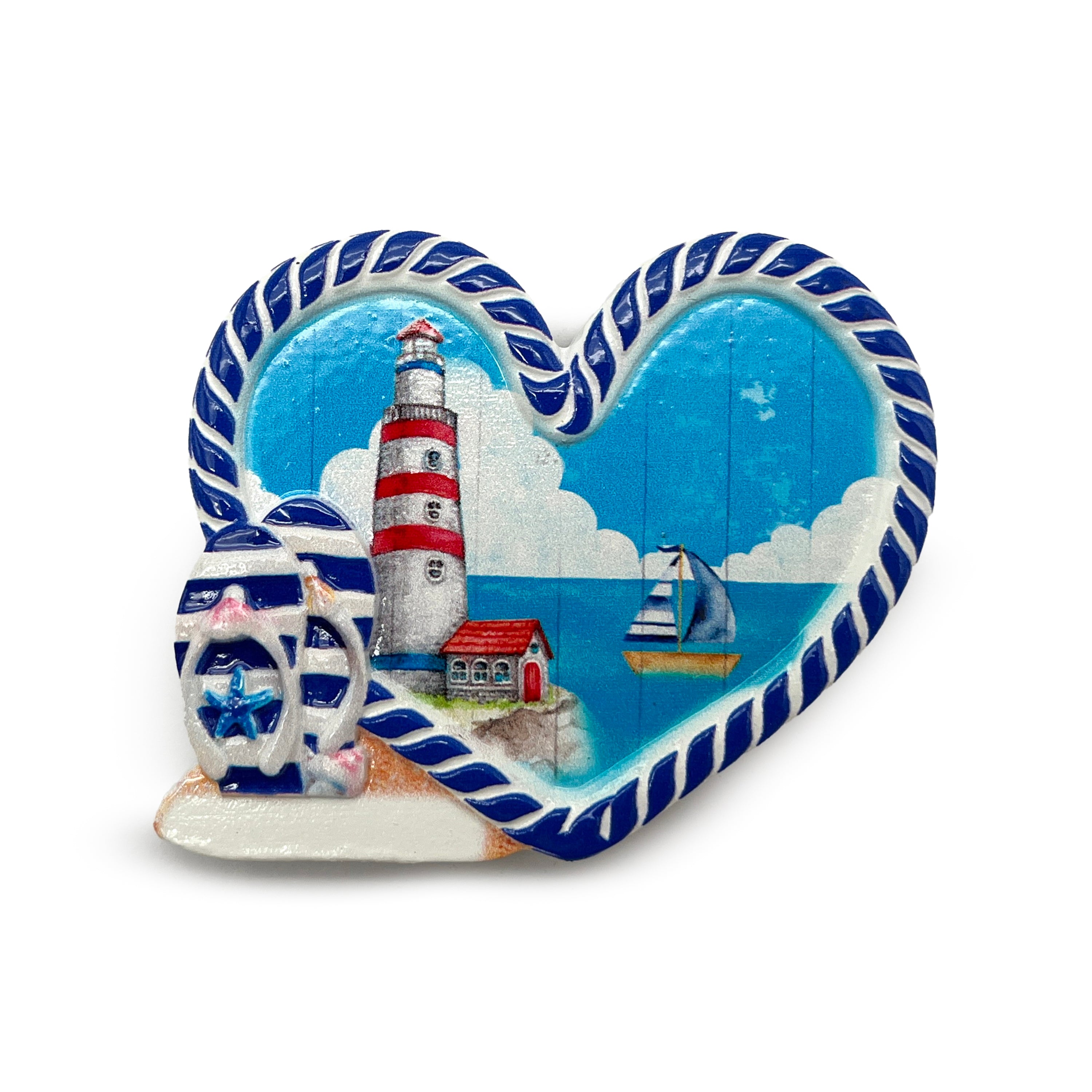 Symbolic Design: Adorn your fridge with this unique heart-shaped magnet, a tender emblem that beautifully frames a picturesque striped lighthouse standing tall, guiding ships, alongside a graceful sailing boat gliding across serene blue waters. It’s a perfect reminder of cherished journeys and hopeful horizons.
