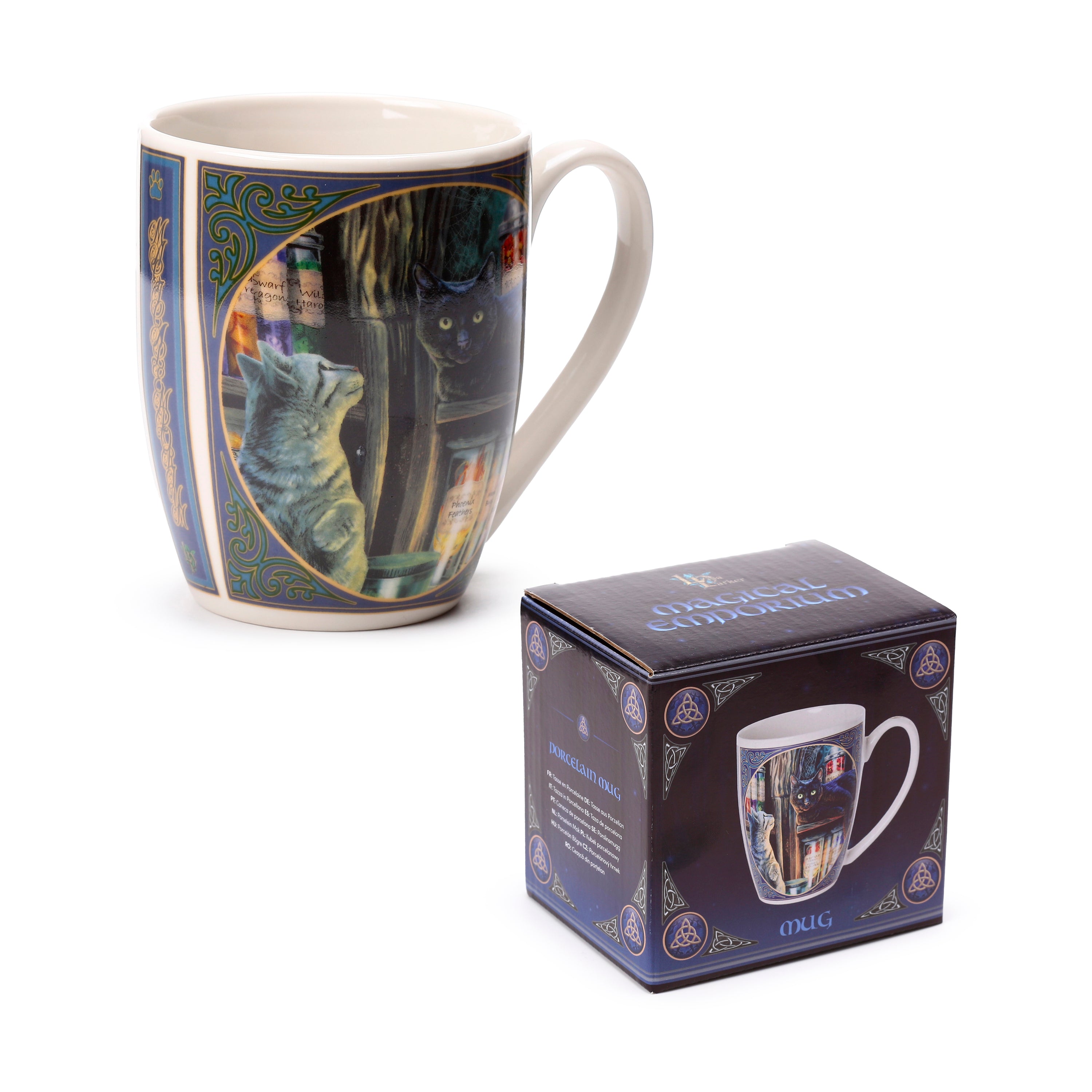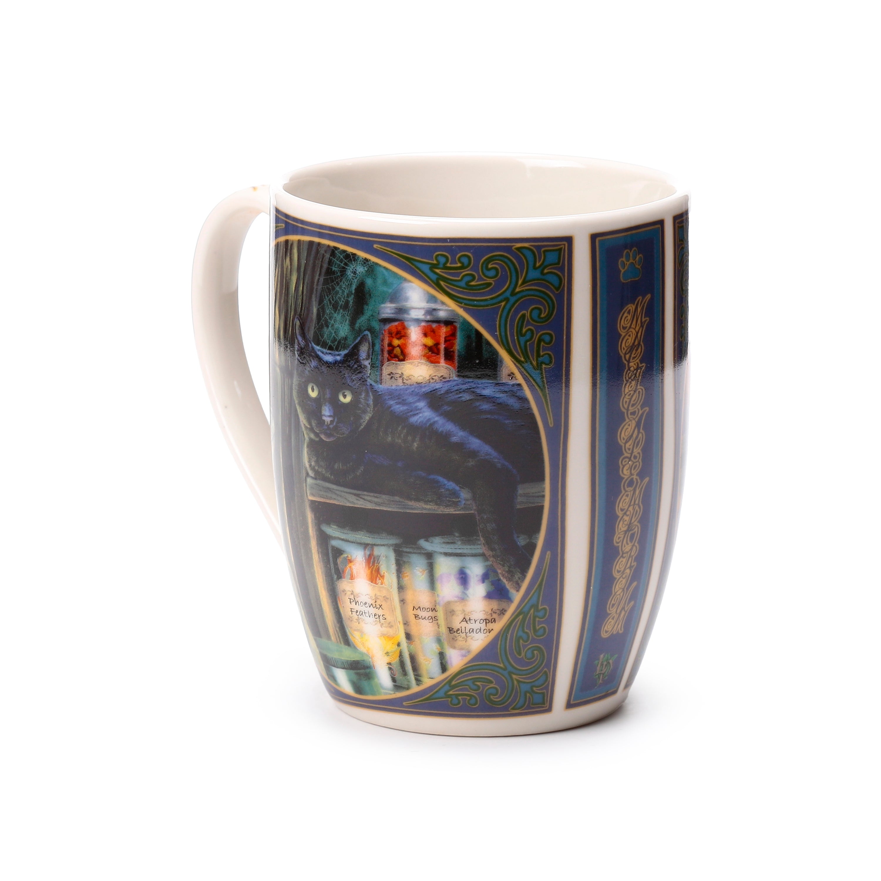 Enchanting Artwork: Adorned with a stunning illustration by Lisa Parker, this mug features a wise black cat with striking green eyes, alongside a curious grey tabby cat, nestled amidst labelled jars of fantastical ingredients like 'Phoenix Feathers' and 'Atropa Belladonna' in a magical emporium. Ornate blue and gold decorative borders, detailed with subtle Celtic knot designs and a paw print, frame this captivating scene, making it a true collector's item.