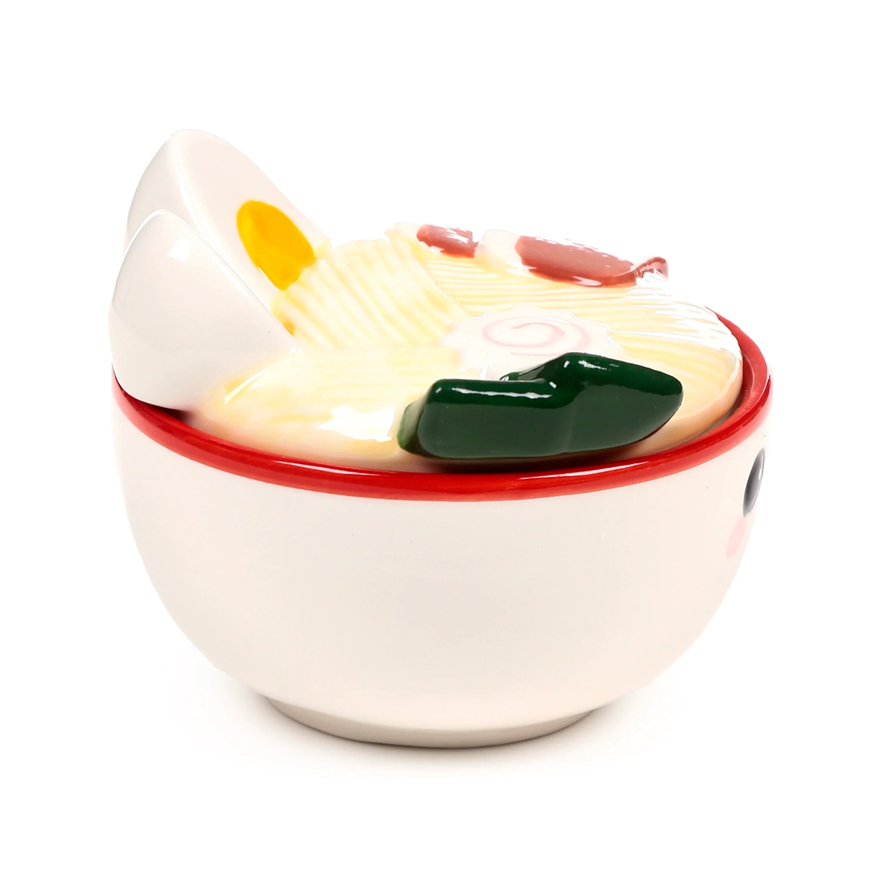Irresistibly Unique Design: Crafted from durable dolomite ceramic, this adorable mug features a creamy white body with a vibrant red rim and handle, sporting Nori’s cheerful, winking face. The true star is the intricately sculpted lid, designed as a miniature ramen bowl, complete with lifelike white noodles, perfect halves of boiled egg, bright green garnish, reddish-brown slices of 'meat', and a classic pink swirl narutomaki fish cake.