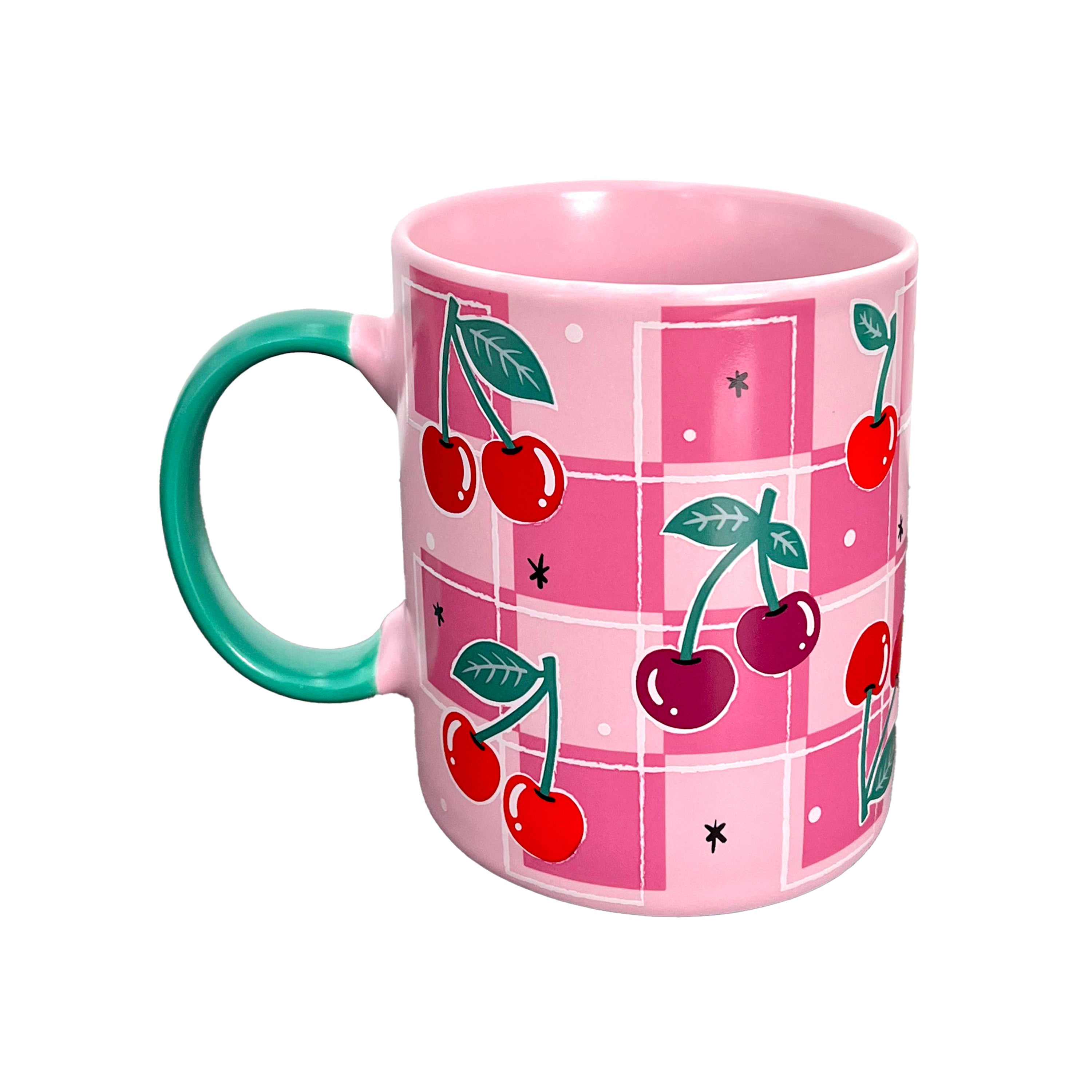Whimsical Design: Adorned with a vibrant gingham pattern, this pretty pink porcelain mug features luscious red and purple cherries, perfectly complemented by a bright green handle for a captivating splash of colour.