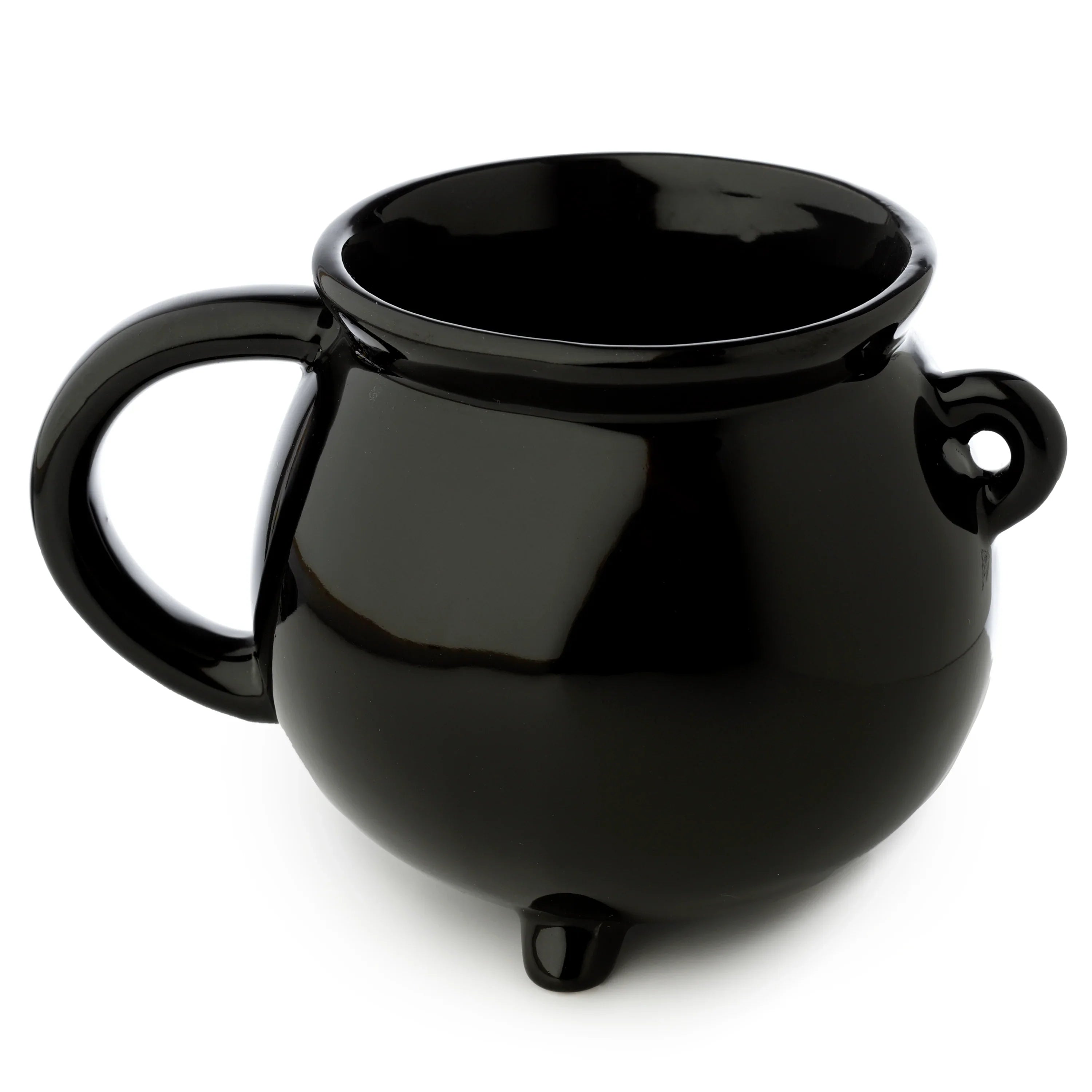 Enchanting Design: Immerse yourself in the magic with this glossy black ceramic mug, meticulously shaped like a classic cauldron. It features a sturdy, curved handle, a charming decorative side loop, and stands securely on three stable base feet, bringing a whimsical touch to your kitchen.