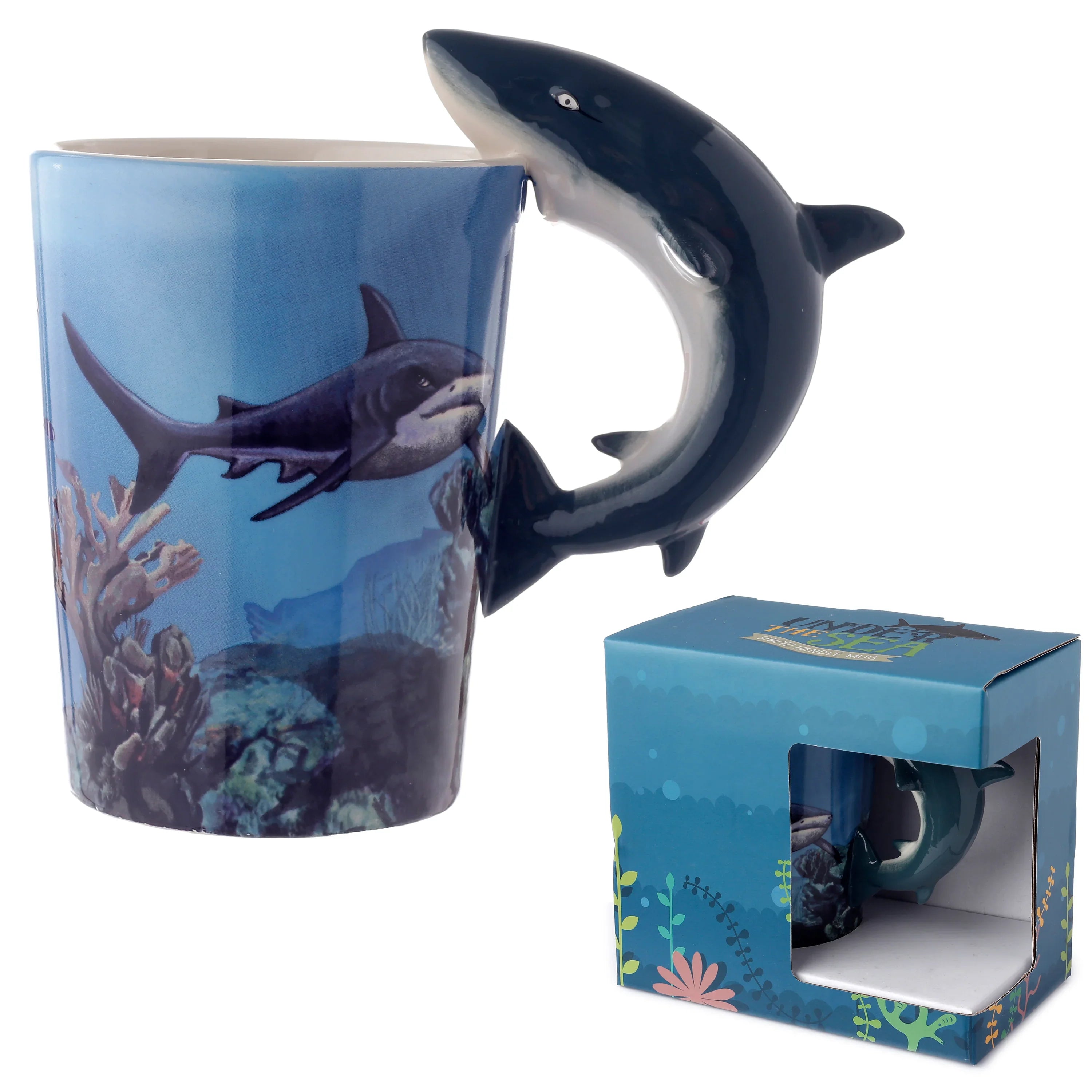 Striking Design & Artistry: Discover a truly unique mug featuring an intricately sculpted, glossy dark blue shark-shaped handle that seamlessly merges with the mug's body. The blue exterior depicts a majestic shark swimming gracefully amidst vibrant coral reefs and smaller fish, all brought to you through the distinctive style of Lisa Parker.