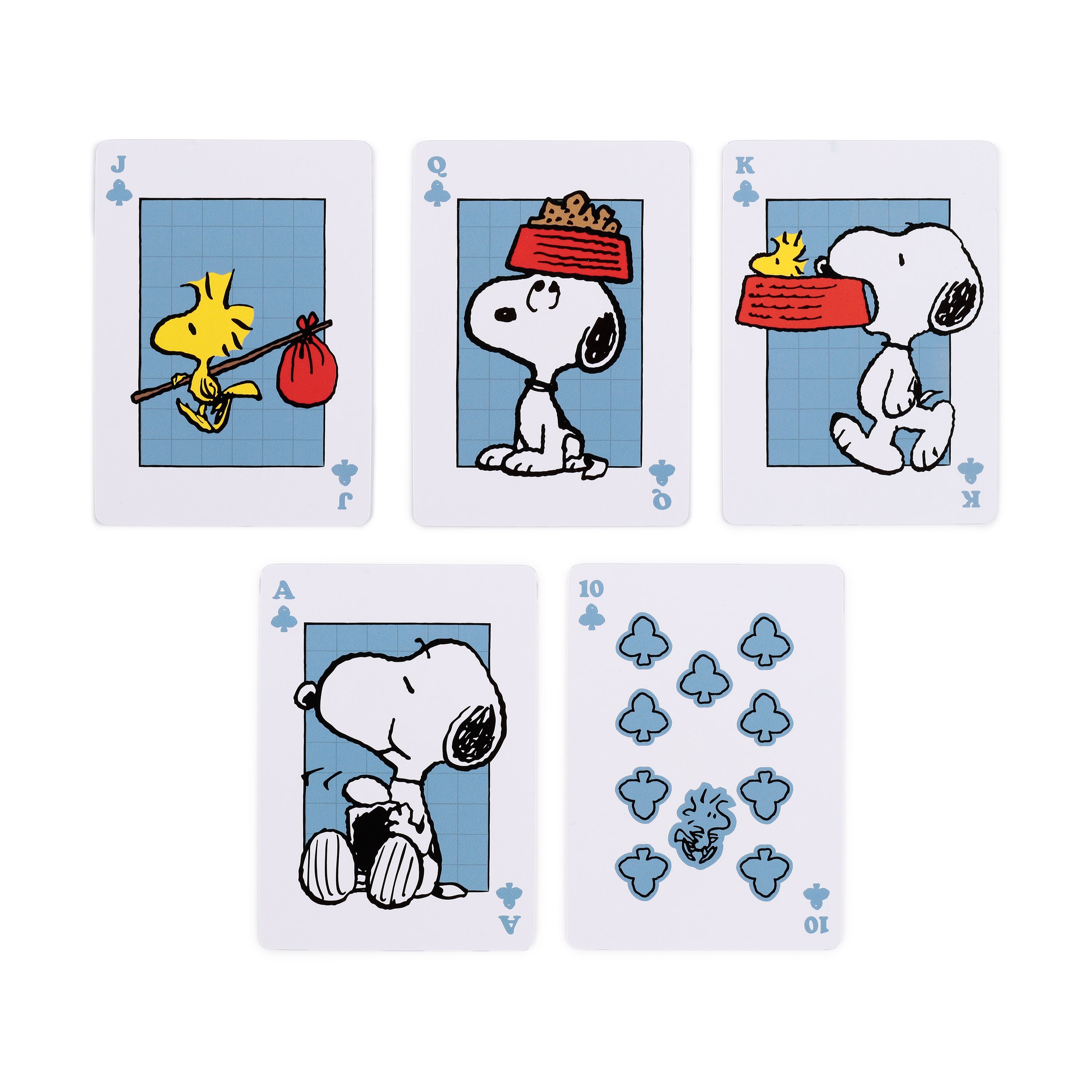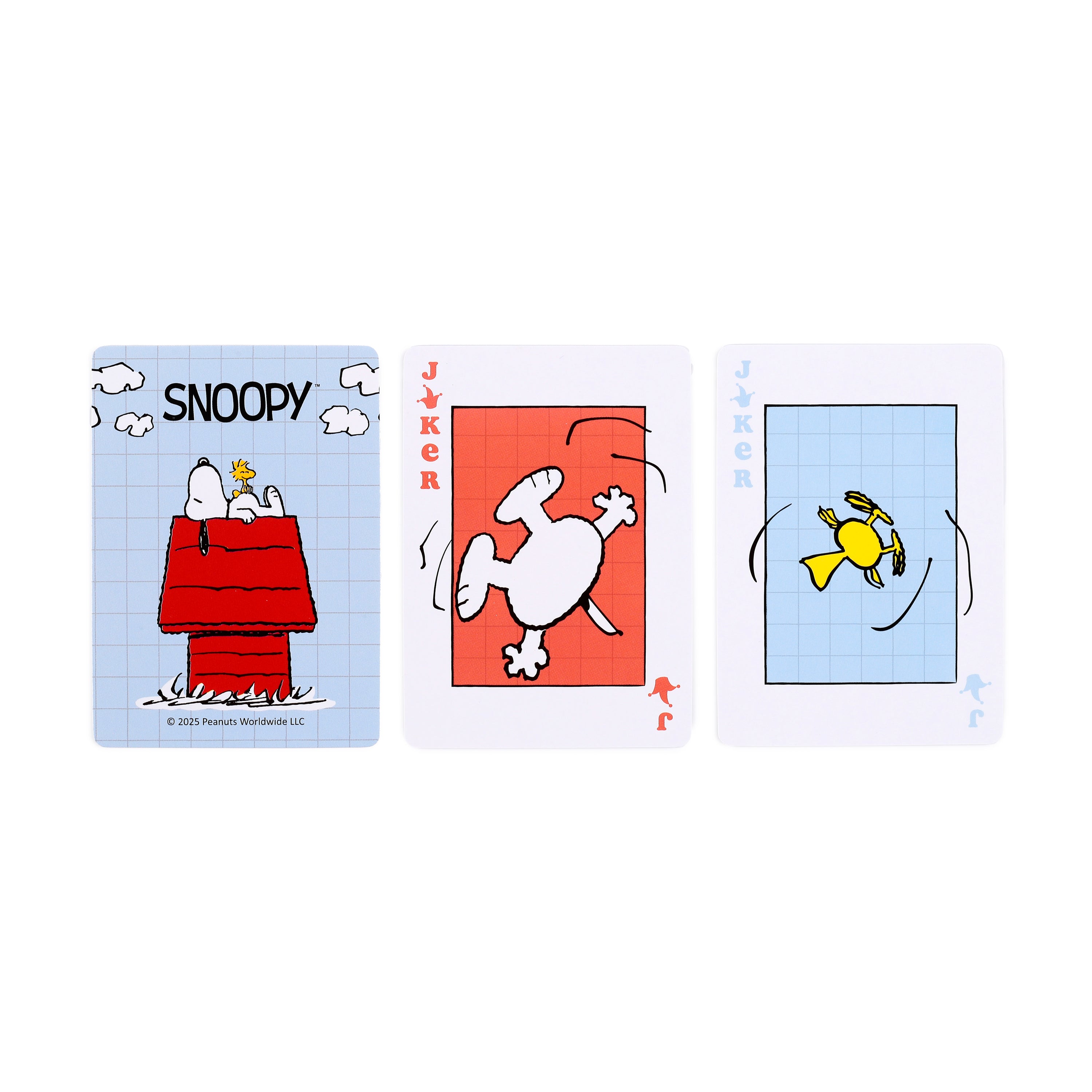 Iconic Peanuts Artwork: Immerse yourself in the whimsical world of Peanuts with every shuffle. The crisp white card box proudly displays Snoopy relaxing on his iconic red doghouse, while the individual cards burst with character. Discover Snoopy unwinding on the three of Hearts, basking under a sun on the Jack of Diamonds, and tenderly holding Woodstock on the King of Clubs, all set against a cheerful light blue grid background.
