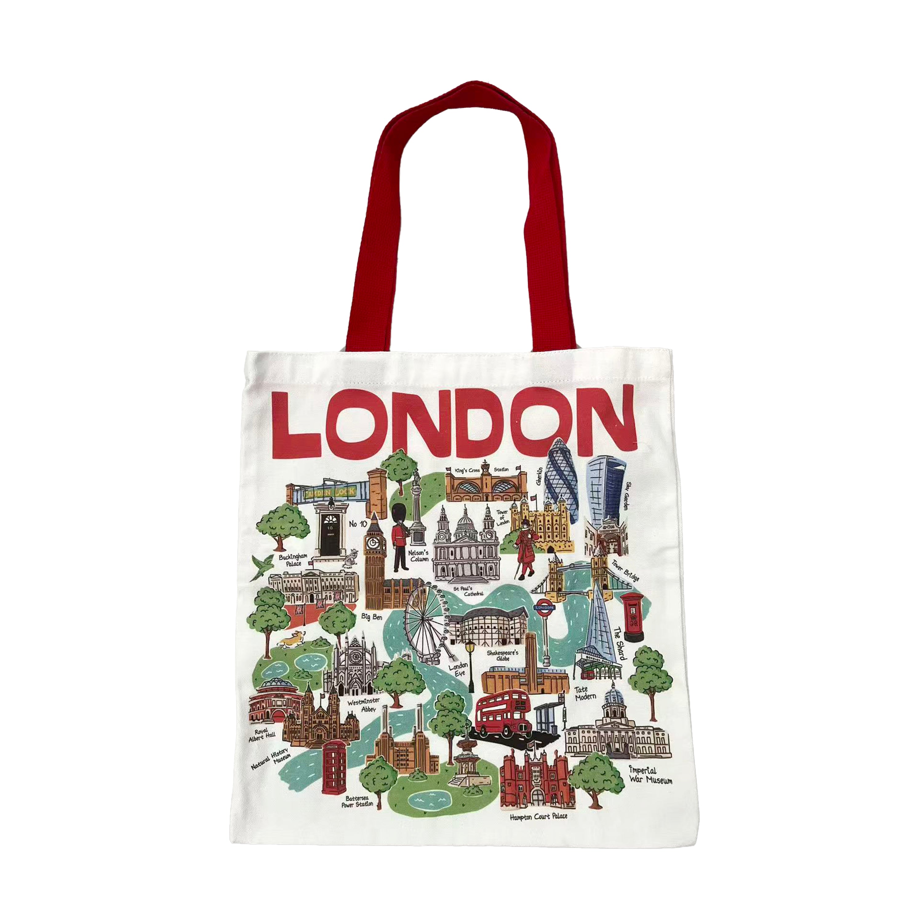 Iconic London Design: Adorned with a vibrant, colourful illustrated map, this white fabric tote proudly displays famous London landmarks including Big Ben, the London Eye, and Tower Bridge, alongside a classic red double-decker bus. The word 'LONDON' is boldly printed in striking red letters at the top, perfectly complemented by the bag's distinctive red handles.