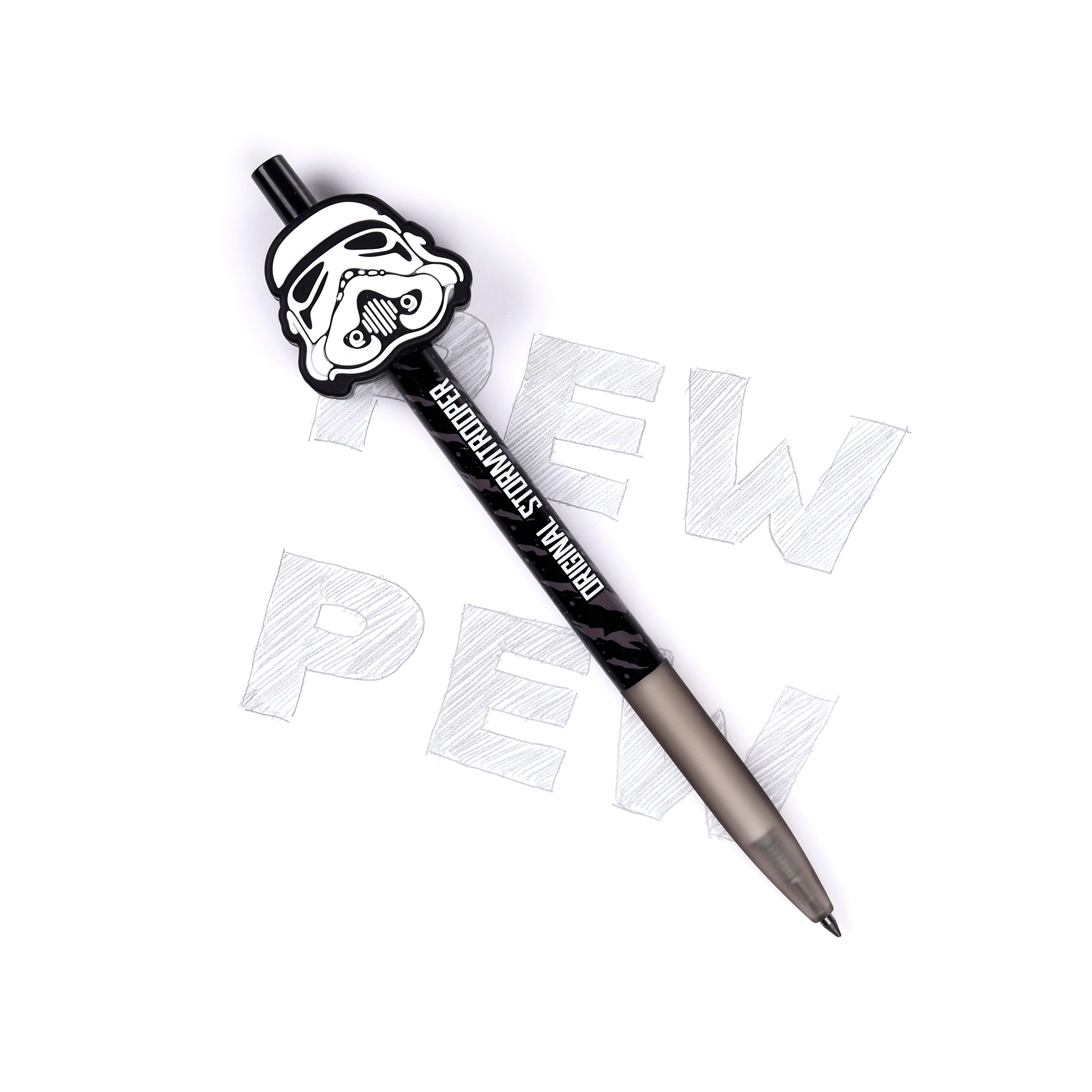 Iconic Design & Functionality: Command attention with a sleek black barrel featuring a grey mottled pattern and distinctive 'ORIGINAL STORMTROOPER' text. It's elegantly crowned by a striking white and black Stormtrooper helmet finial, making it a true collector's item. A simple click of the ridged black top effortlessly releases the writing tip, preparing you for action.