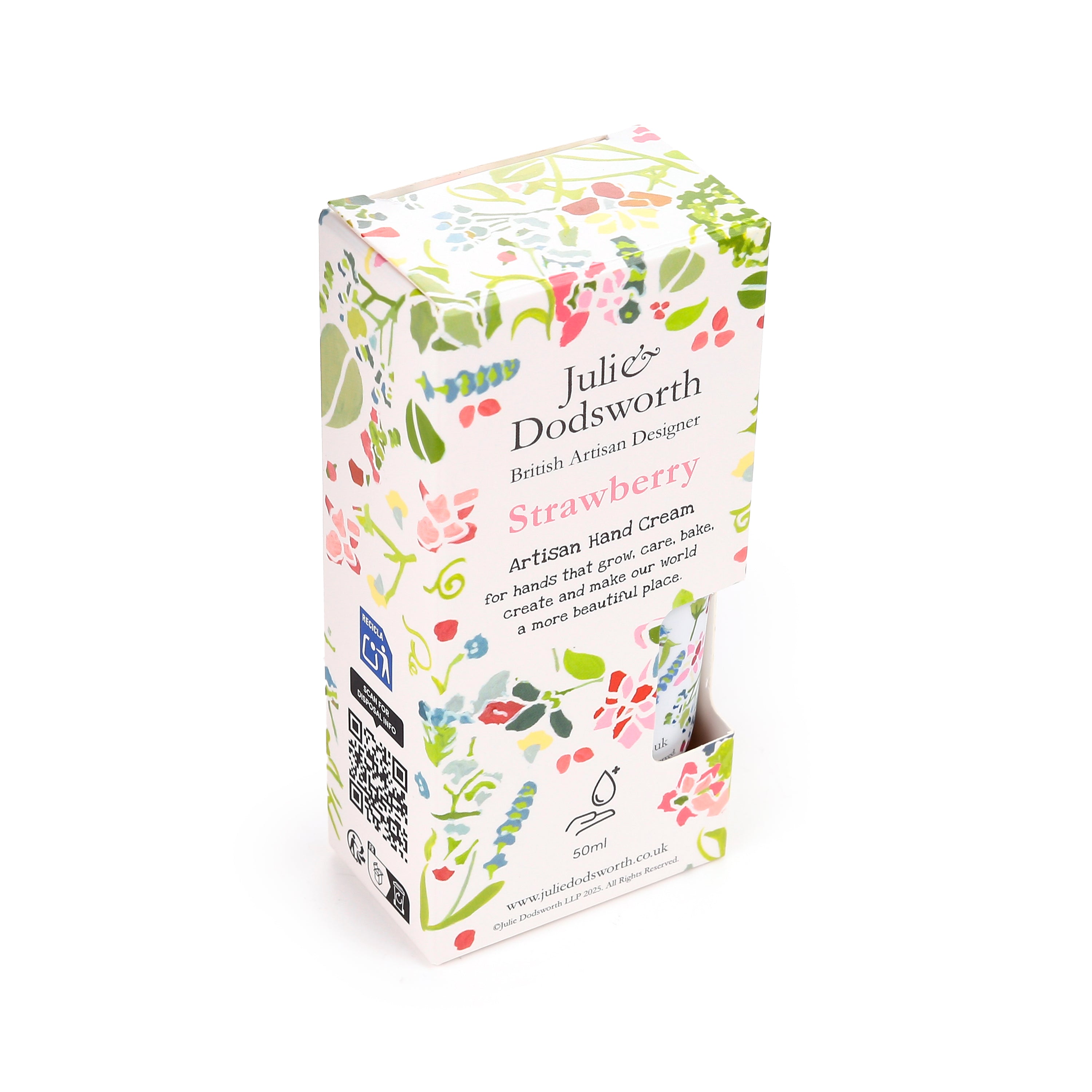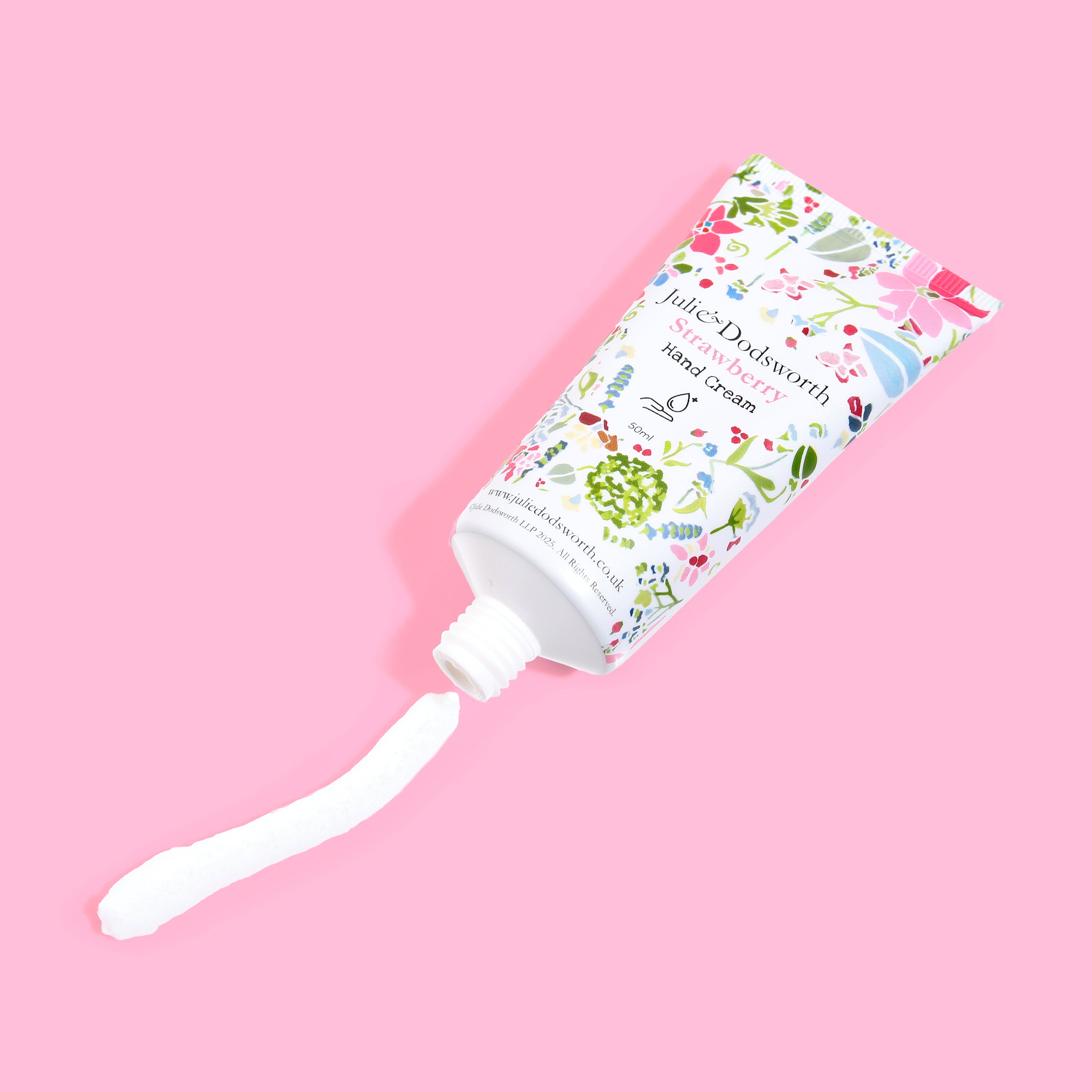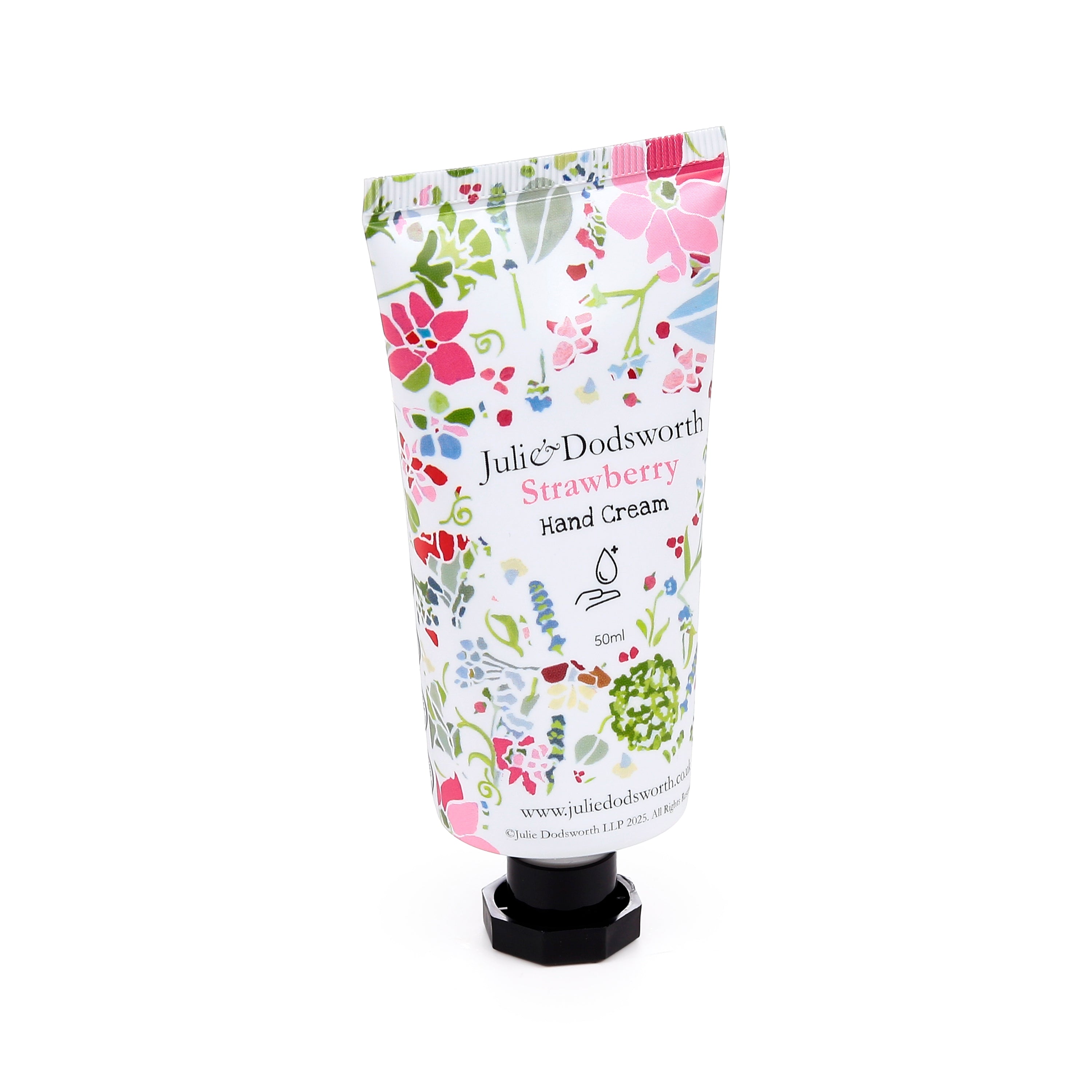 Charming Botanical Design: Adorned with a vibrant pink botanical floral pattern, this white tube features elegant 'Strawberry Hand Cream' text and is topped with a sophisticated black hexagonal cap, reflecting the artistic flair of Julie Dodsworth.