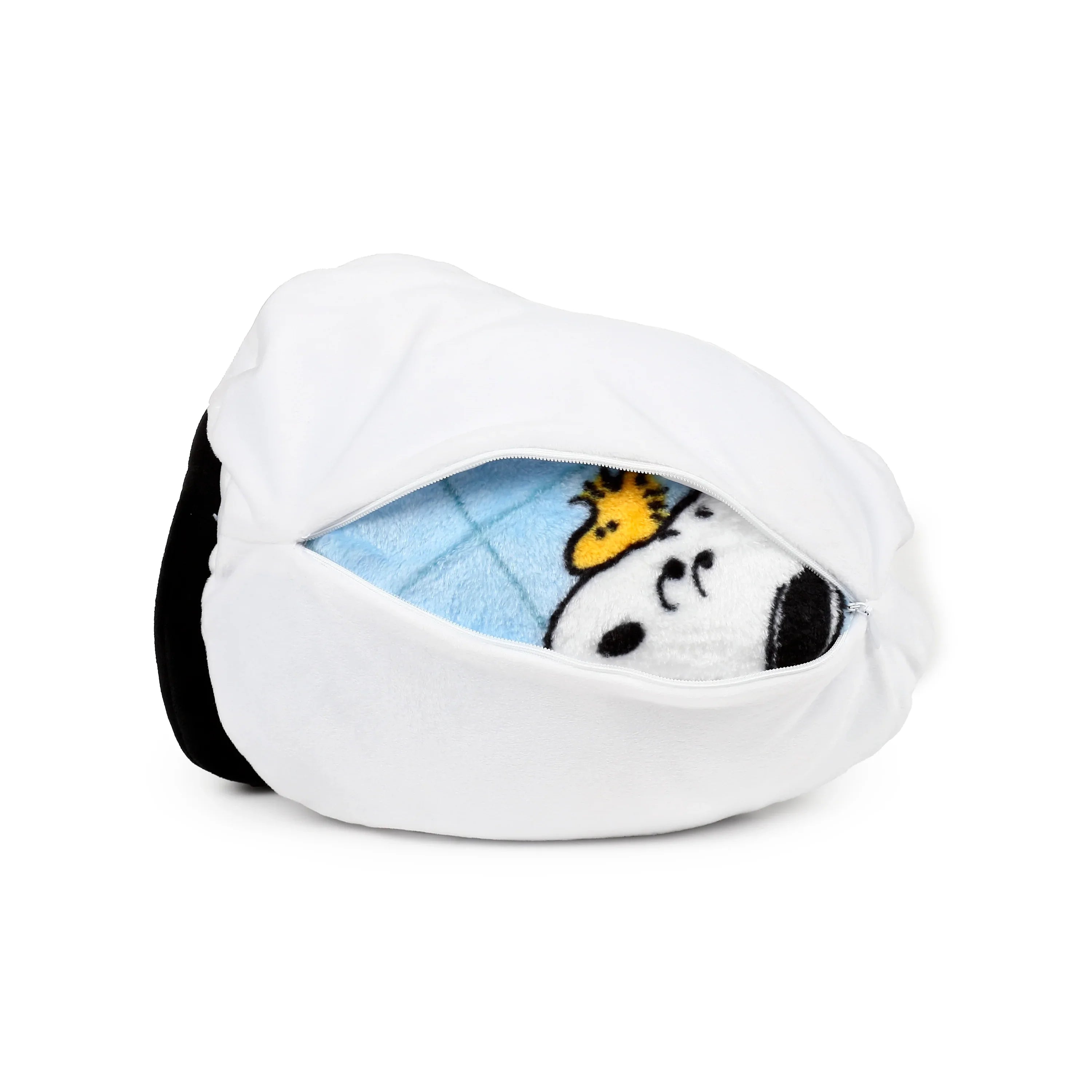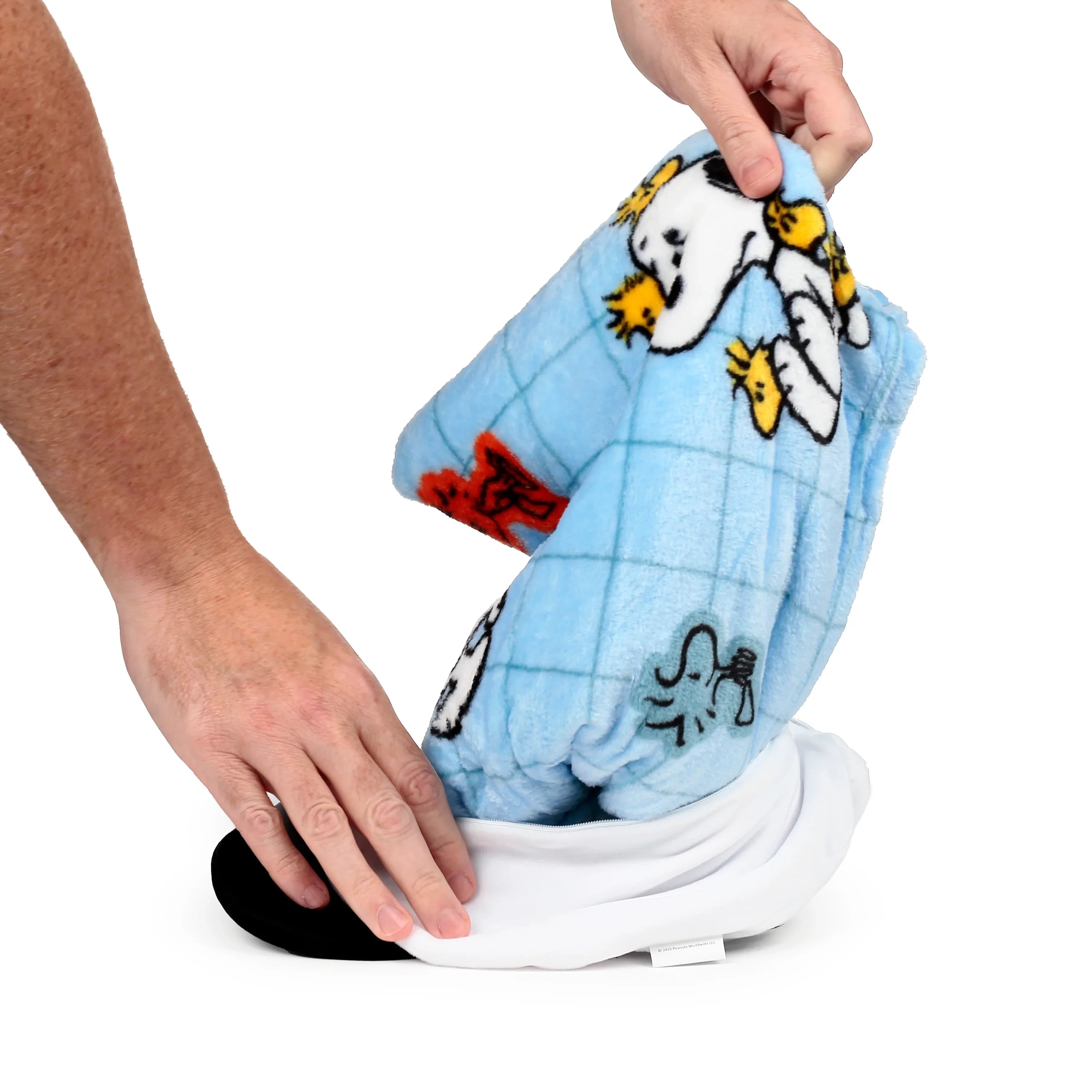 Dual Delight: Unzip the back of the charming white Snoopy plush toy – complete with its iconic black floppy ear and embroidered facial features – to reveal a soft, light blue travel blanket featuring multiple playful Snoopy and colourful Woodstock characters amidst a subtle grid pattern.