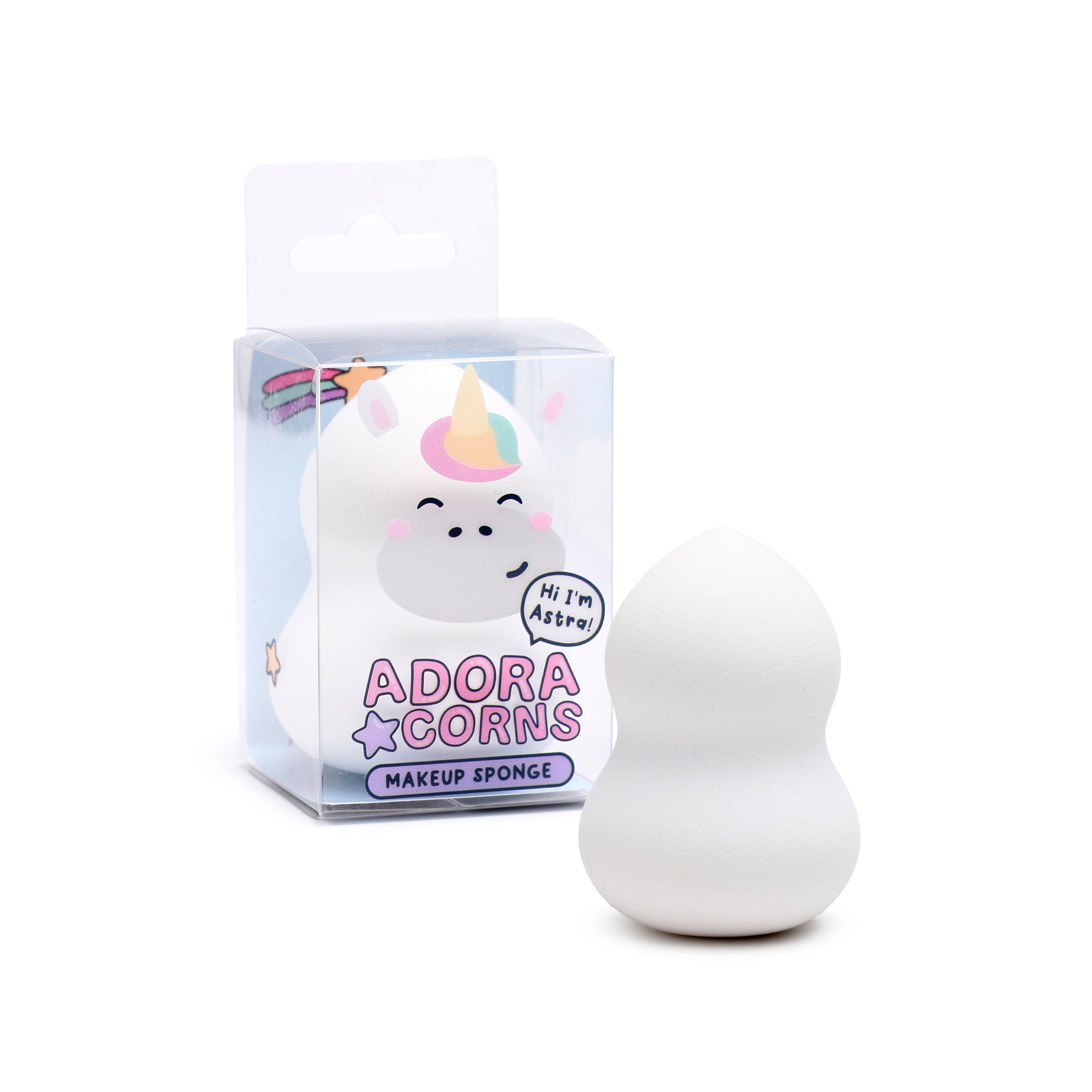 • Whimsical Charm: Discover Astra the Unicorn, depicted with a vibrant, colourful horn, adorning the delightful packaging of your pristine white beauty blender, making it a charming addition to any makeup collection or a joyous gift.