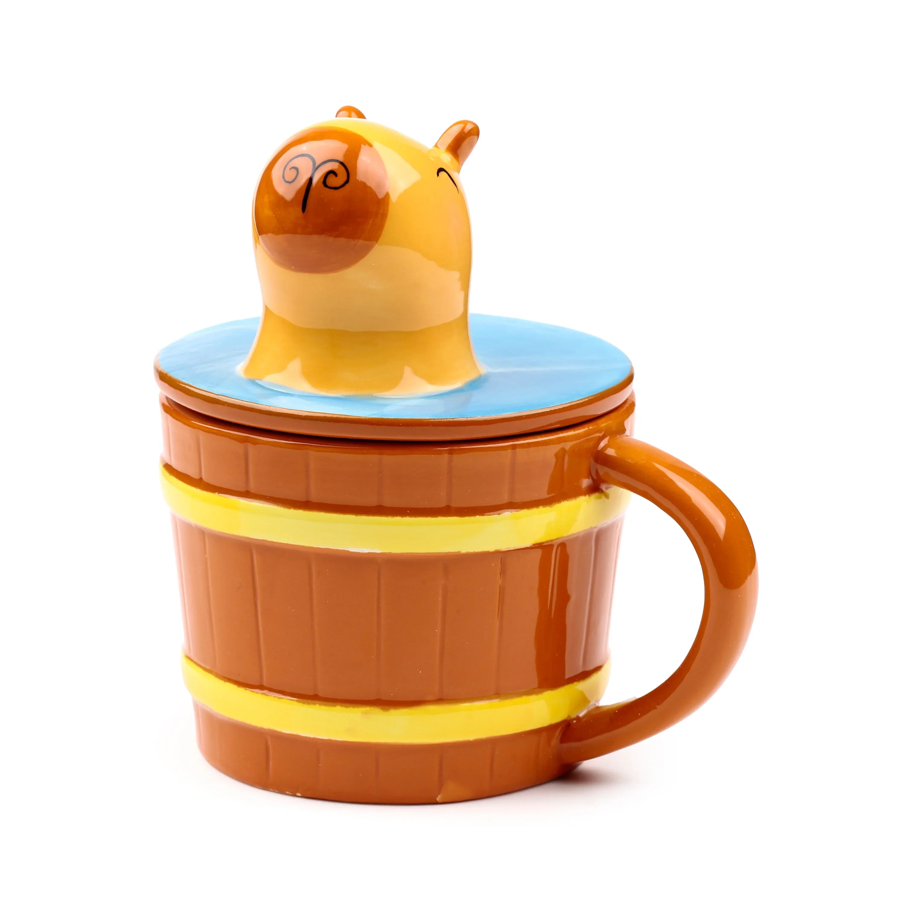 Whimsical Design: Crafted from durable dolomite ceramic, this unique mug is shaped like a rustic brown barrel, complete with vertical ridges and two vibrant yellow bands. A sweet, smiling capybara head playfully emerges from the light blue lid, making it a truly distinctive piece of drinkware.