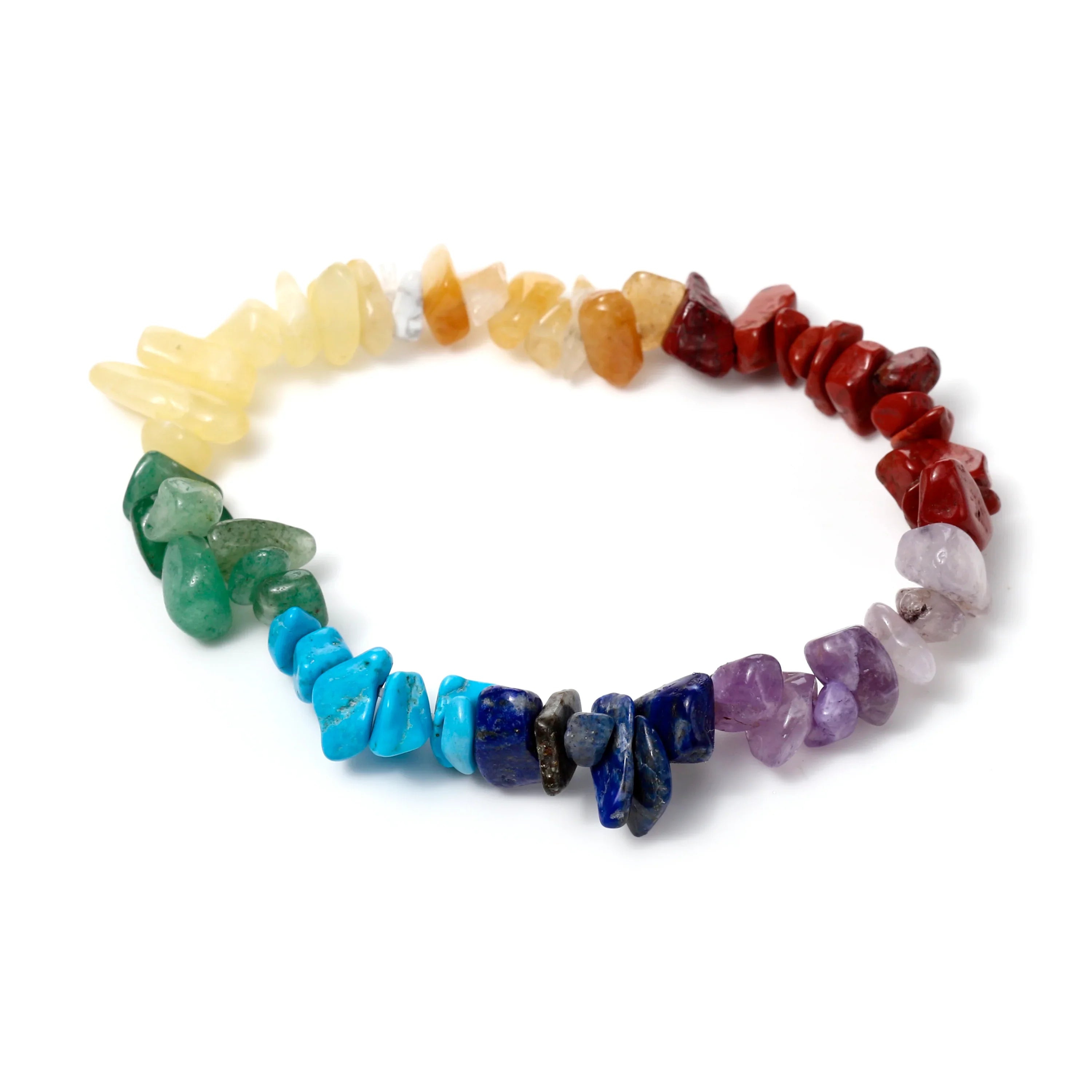 • Vibrant Chakra Alignment: Discover a spectrum of positive energy with this bracelet, featuring irregularly shaped and tumbled chakra stones in a stunning rainbow gradient. Each stone, from deep red to rich purple hues, is carefully selected to represent and balance your body's energetic points, as beautifully captured in its top-down display.