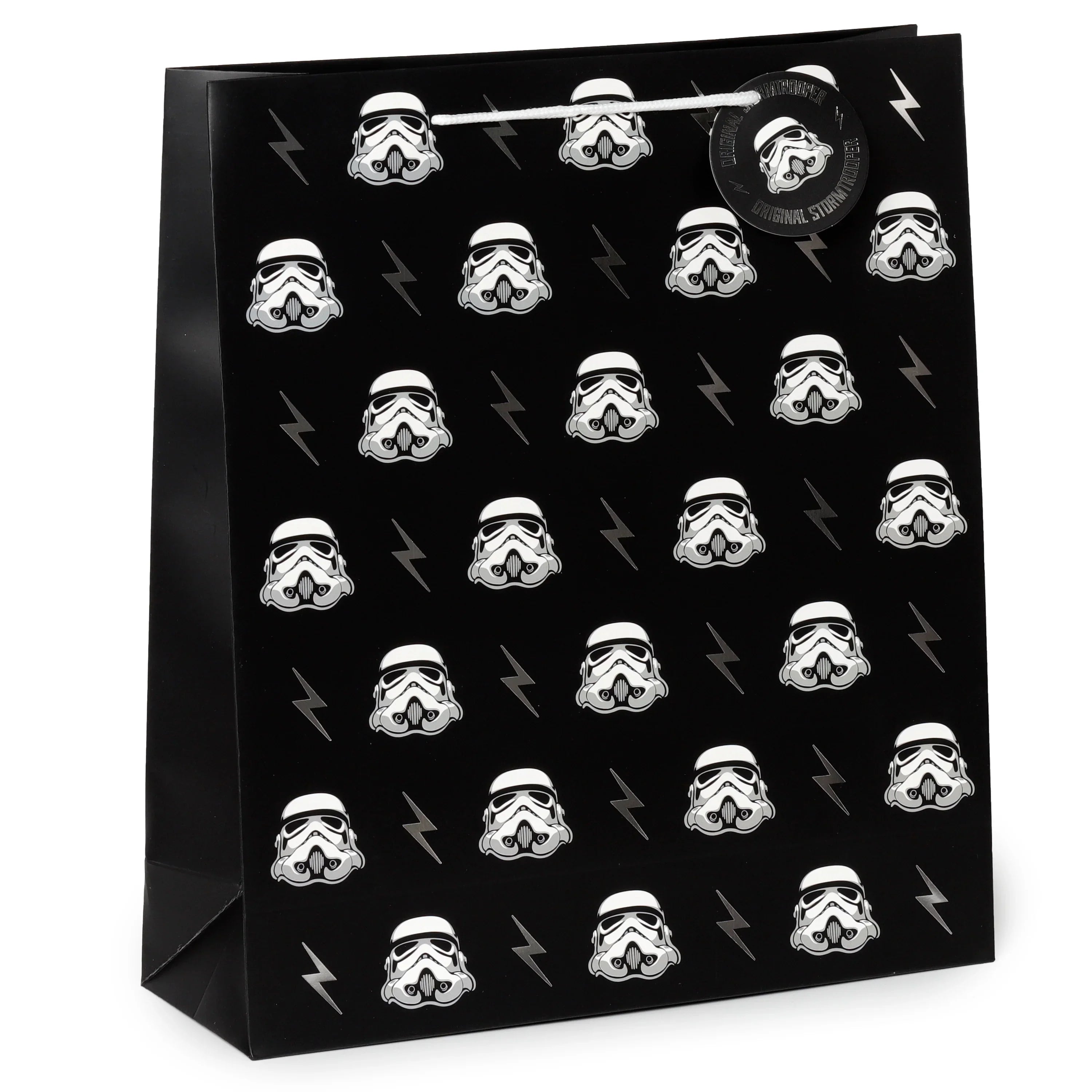 Premium Authenticity: Crafted from durable card and featuring robust white rope handles for easy carrying, this gift bag boasts a distinct circular tag attached to the cord handles, proudly displaying 'Original Stormtrooper' text, signifying its authentic, official licensing and adding a premium touch.