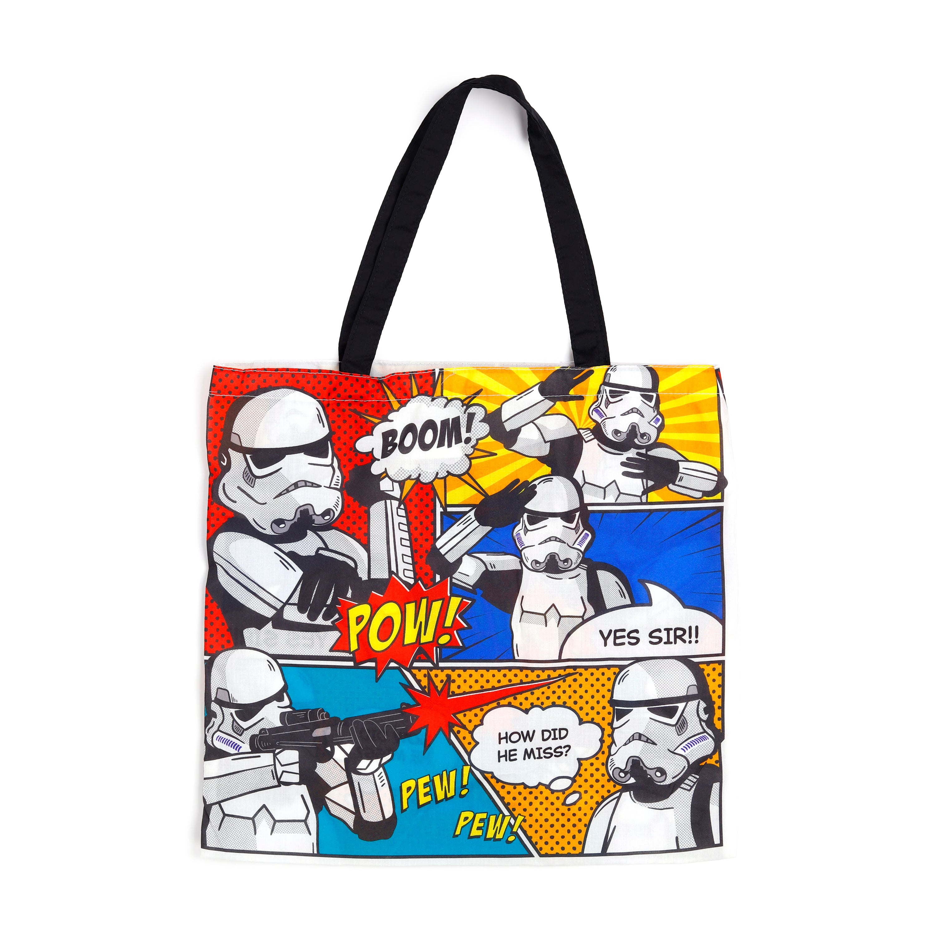 Join the Empire's eco-friendly initiative with this sensational Handy Foldable RPET Shopping Bag, featuring an exclusive Original Stormtrooper comic strip design. Far from just a practical carry-all, this vibrant tote bag is a bold statement piece for any galactic enthusiast, proving that even Stormtroopers can be sustainably stylish.