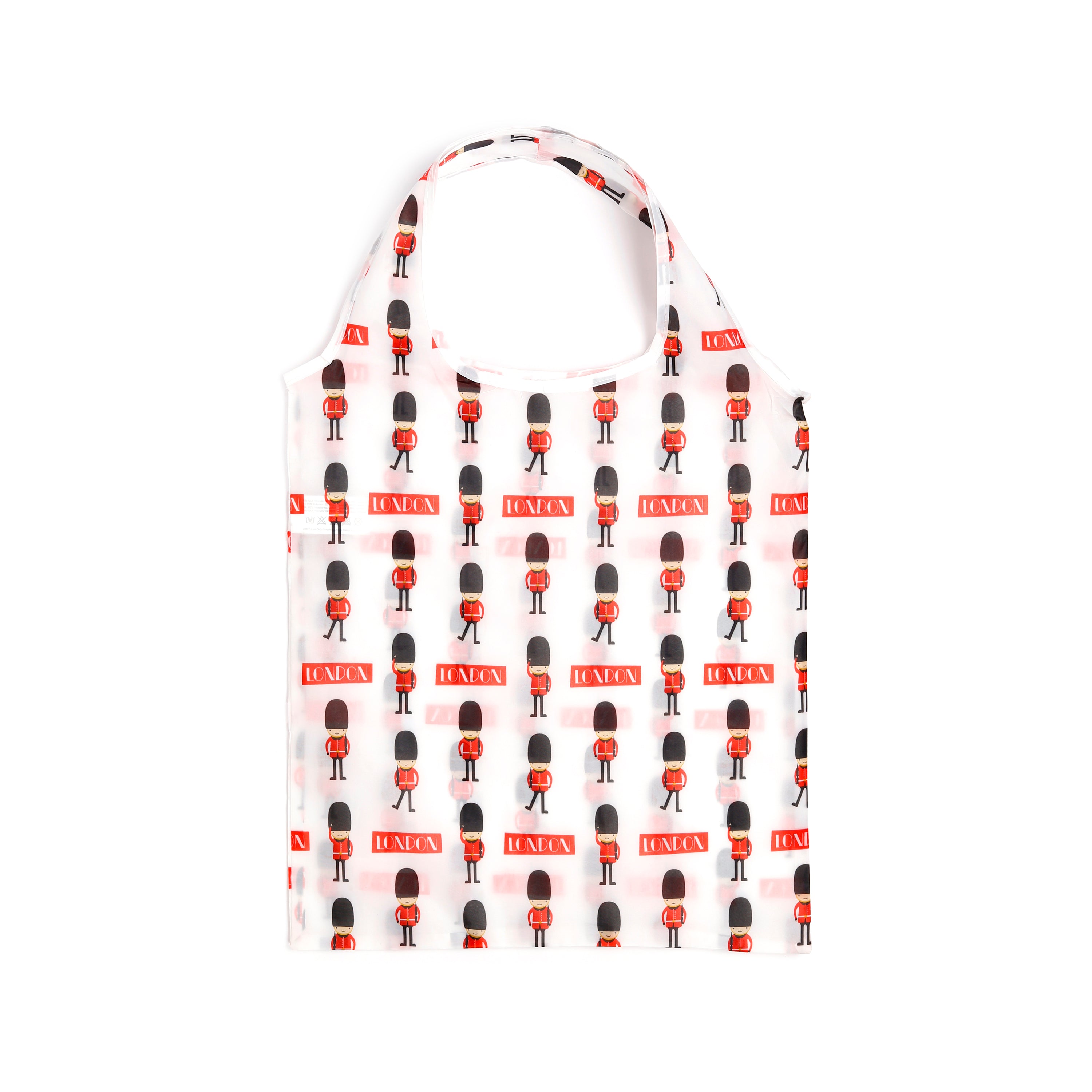 - Iconic London Design: Stand out with a striking white shopping tote bag adorned with a playful, repeating pattern of red London Guardsmen and bold 'LONDON' text. When folded, it transforms into an adorable Guardsman's head pouch, featuring a distinctive black top, a vibrant red band with 'LONDON' in white, and a friendly beige face complete with eyes and a smile – a true pocket-sized piece of the capital.