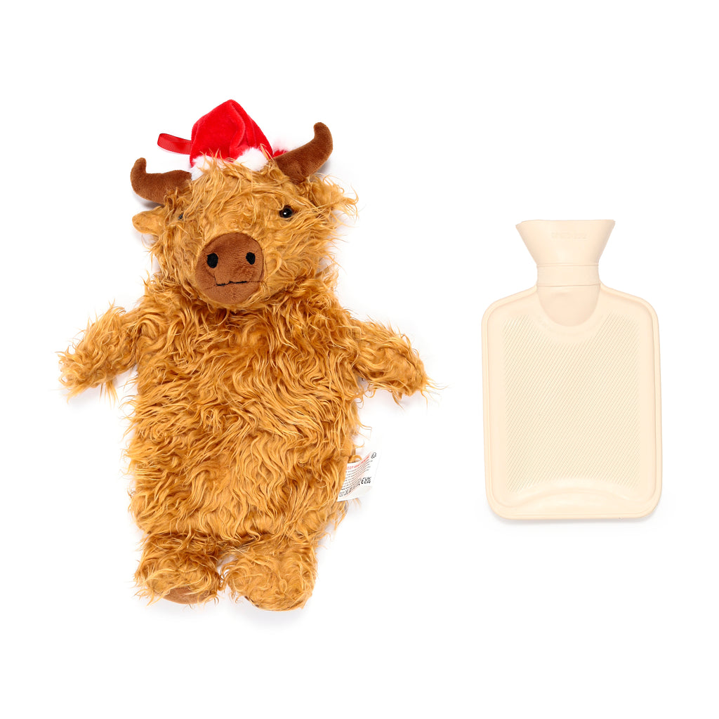 Iconic Festive Design: Snuggle up with our lovable Highland Coo hot water bottle, boasting a shaggy brown plush cover and a cheerful red Santa hat, perfect for adding a touch of whimsical warmth to your Christmas décor and cold-weather routines.