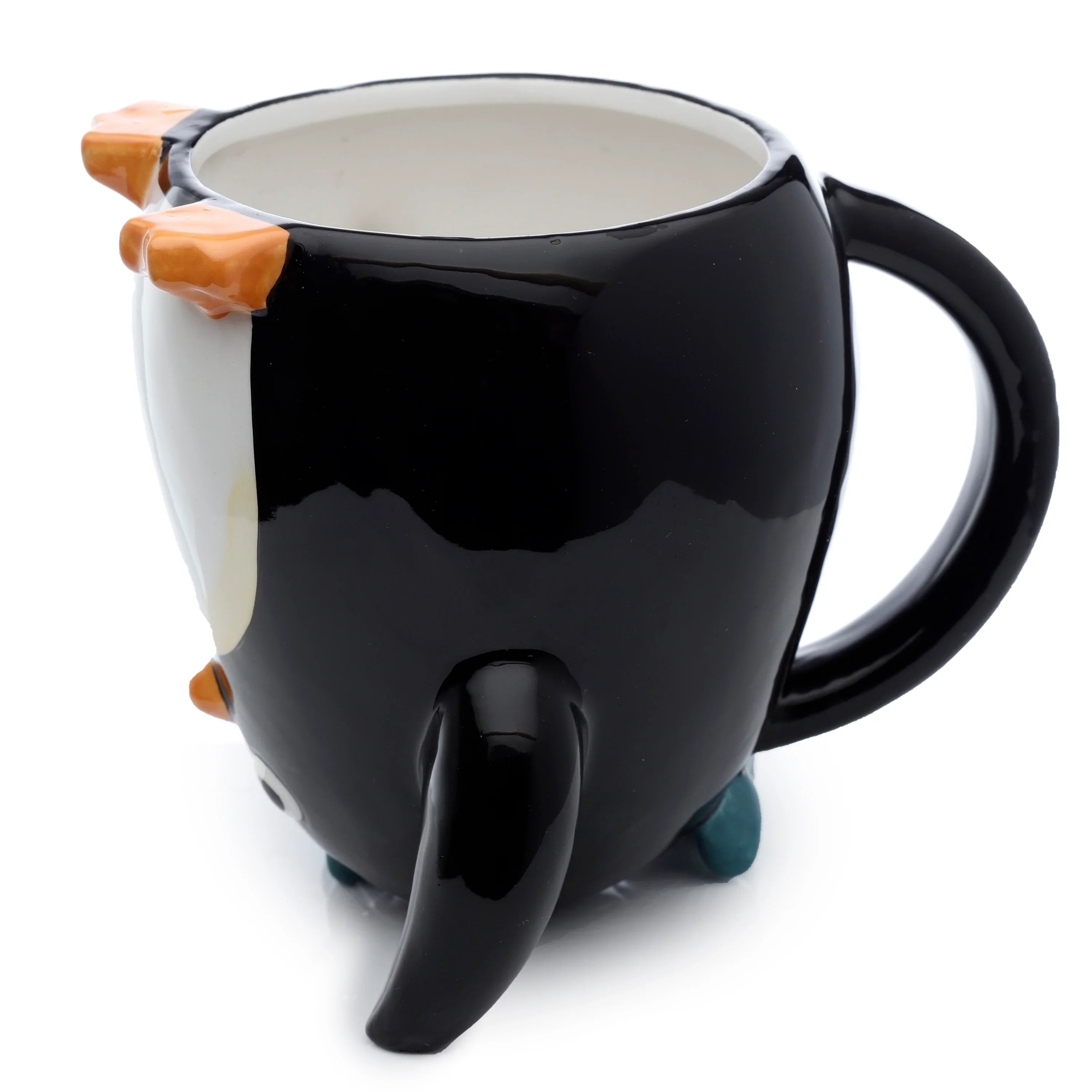 • Whimsical Upside-Down Design: Discover a truly unique drinking experience with this glossy black and white ceramic penguin, ingeniously crafted to appear as if it's merrily diving into your favourite beverage. Its bright orange feet playfully perch on the rim, while its endearing face, complete with an orange beak, white eyes, black pupils, and two charming blue fish details, forms the base.