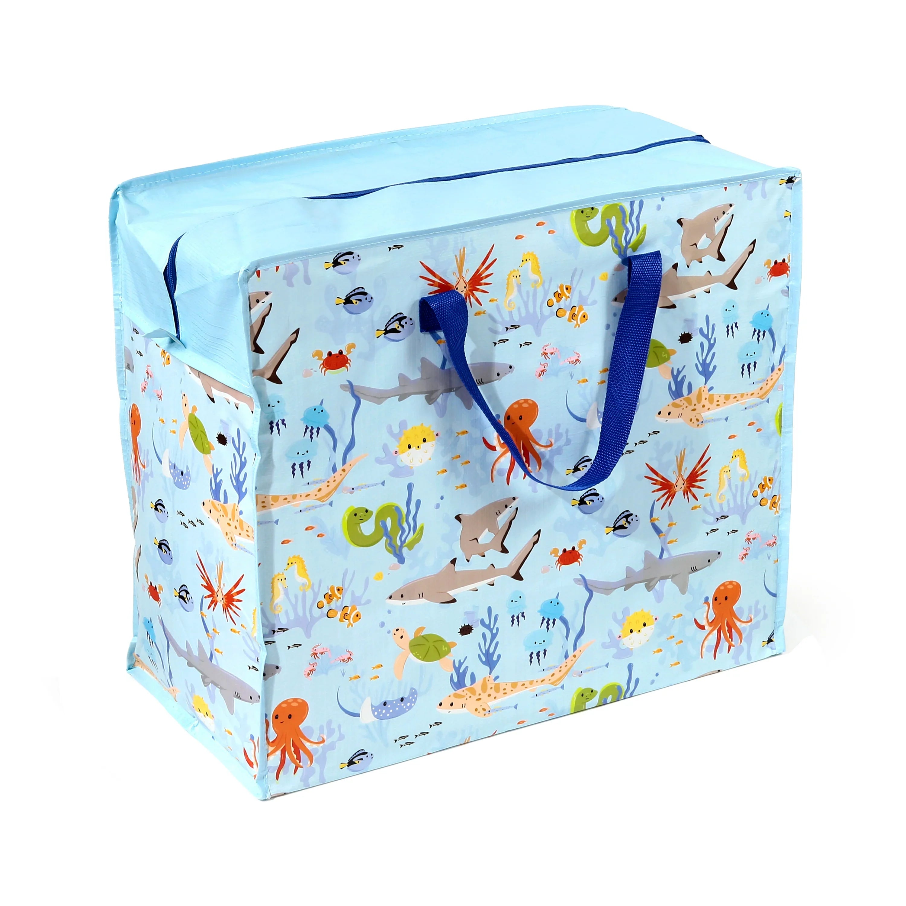 Underwater Wonder Design: Adorned with a captivating light blue background, this bag features a colourful, cartoon-style marine life print. Discover friendly sharks, playful octopuses, graceful turtles, delicate seahorses, and a variety of delightful fish, including clownfish and jellyfish, all swimming together to create a truly unique aesthetic.