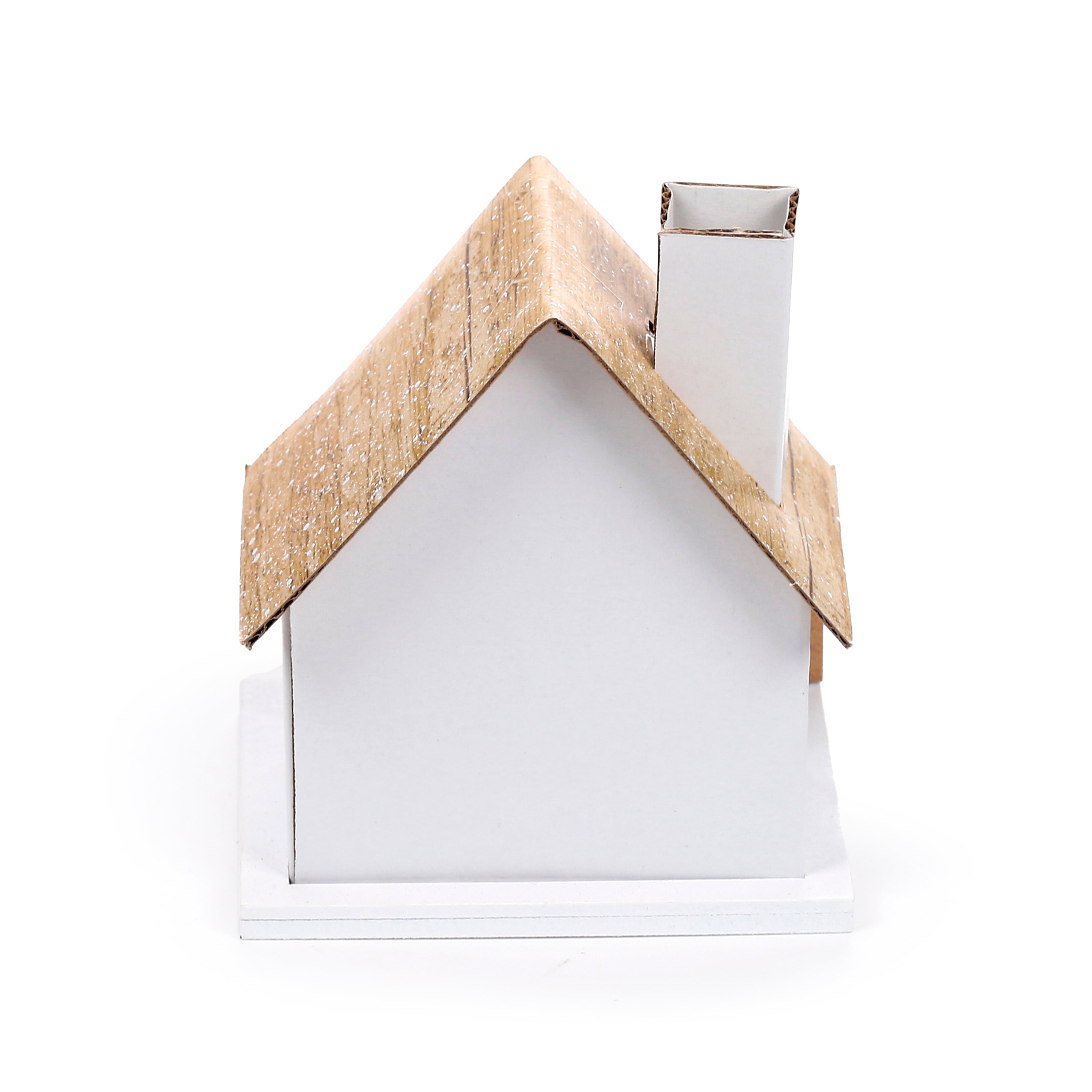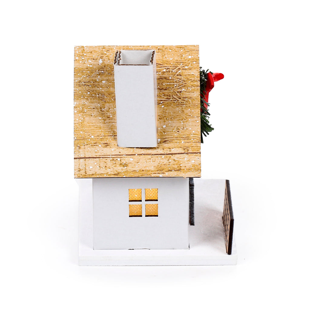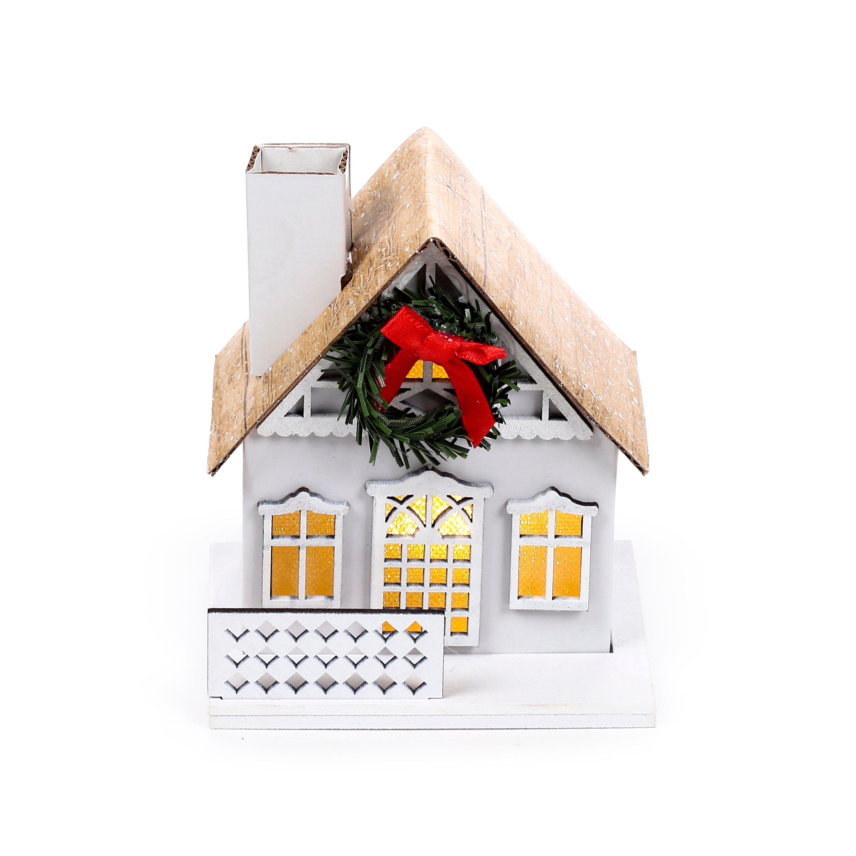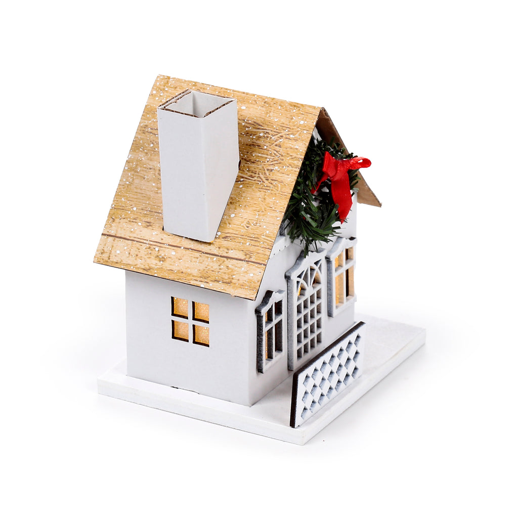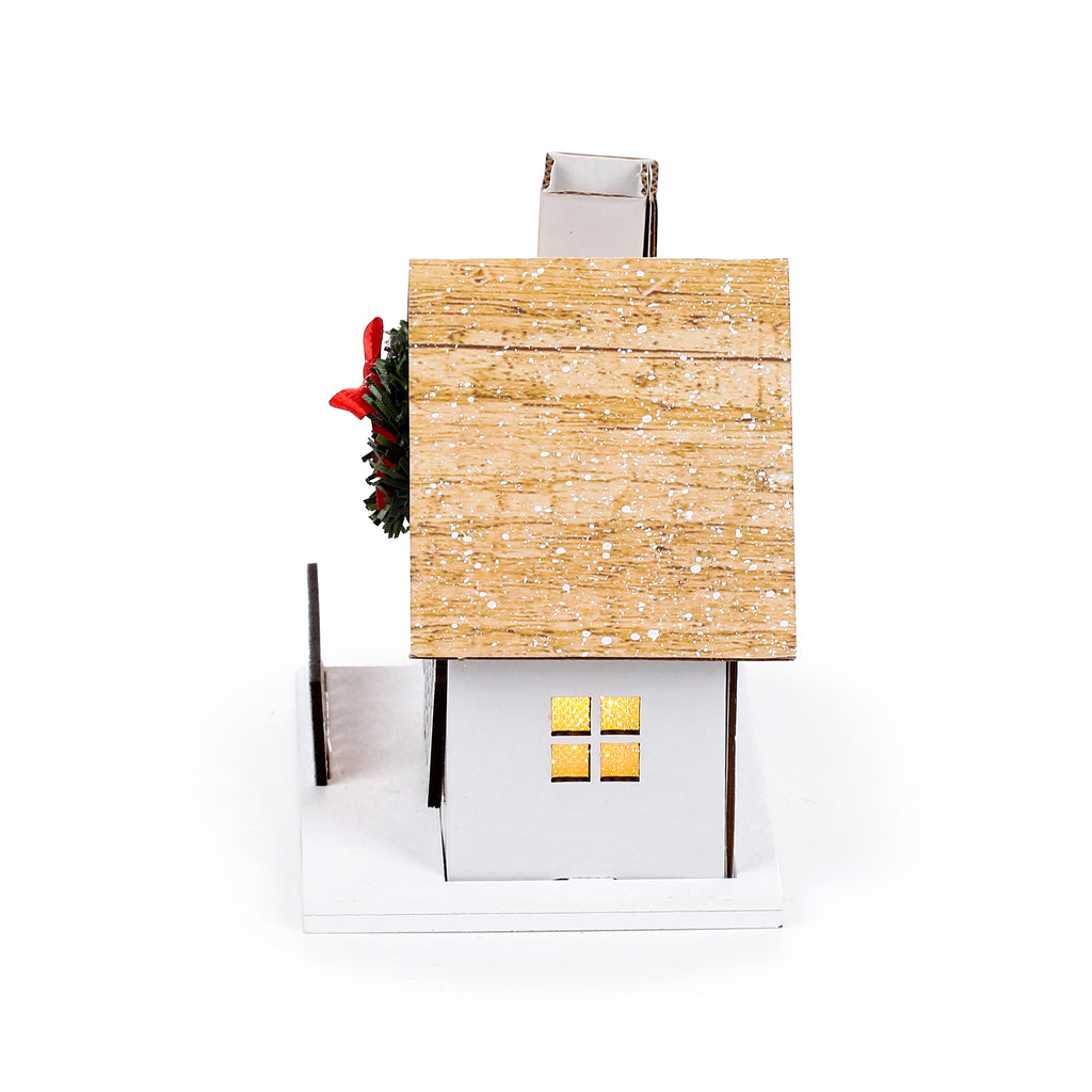 Intricate Festive Details: Marvel at the charming design, featuring a snow-kissed glittery grey roof, a pristine white chimney, and a vibrant green wreath with a bright red bow adorning the gable, all crafted to evoke classic Christmas charm.