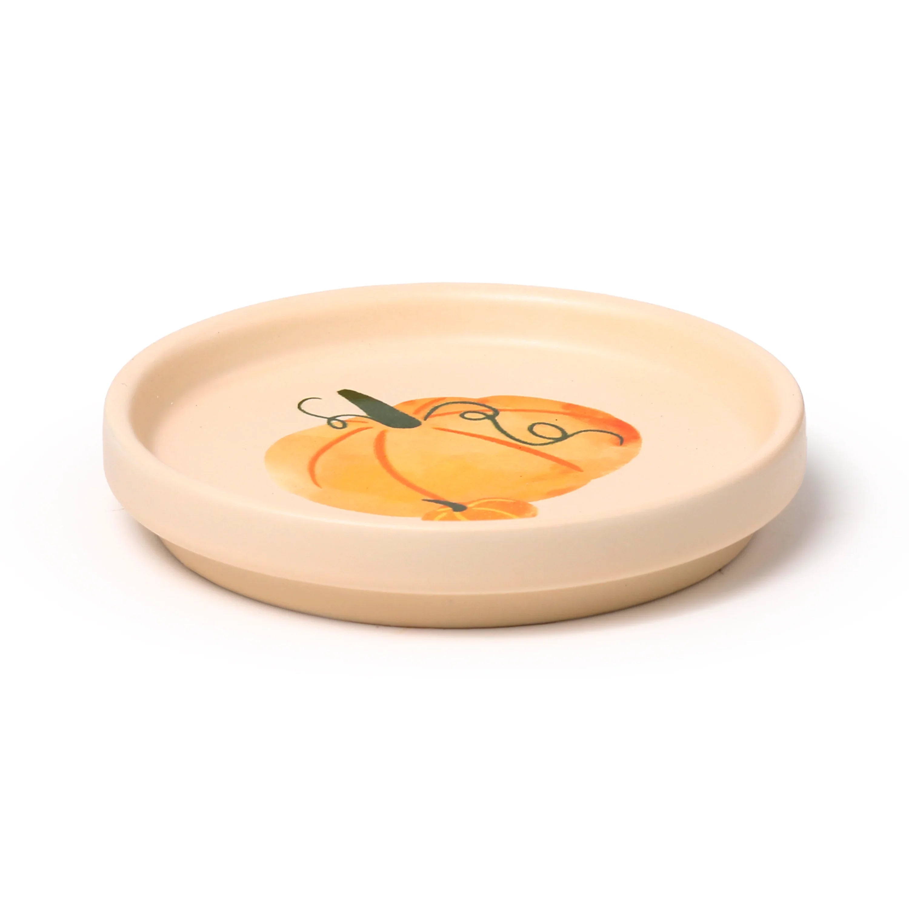 Seasonal Charm: Adorn your home with the delightful spirit of autumn. This cream porcelain mug and its matching coaster lid are beautifully decorated with an 'Autumn Harvest' design, showcasing a vibrant array of colourful pumpkins, gourds, and whimsical mushrooms. The lid itself features a prominent orange pumpkin, completing the festive look.