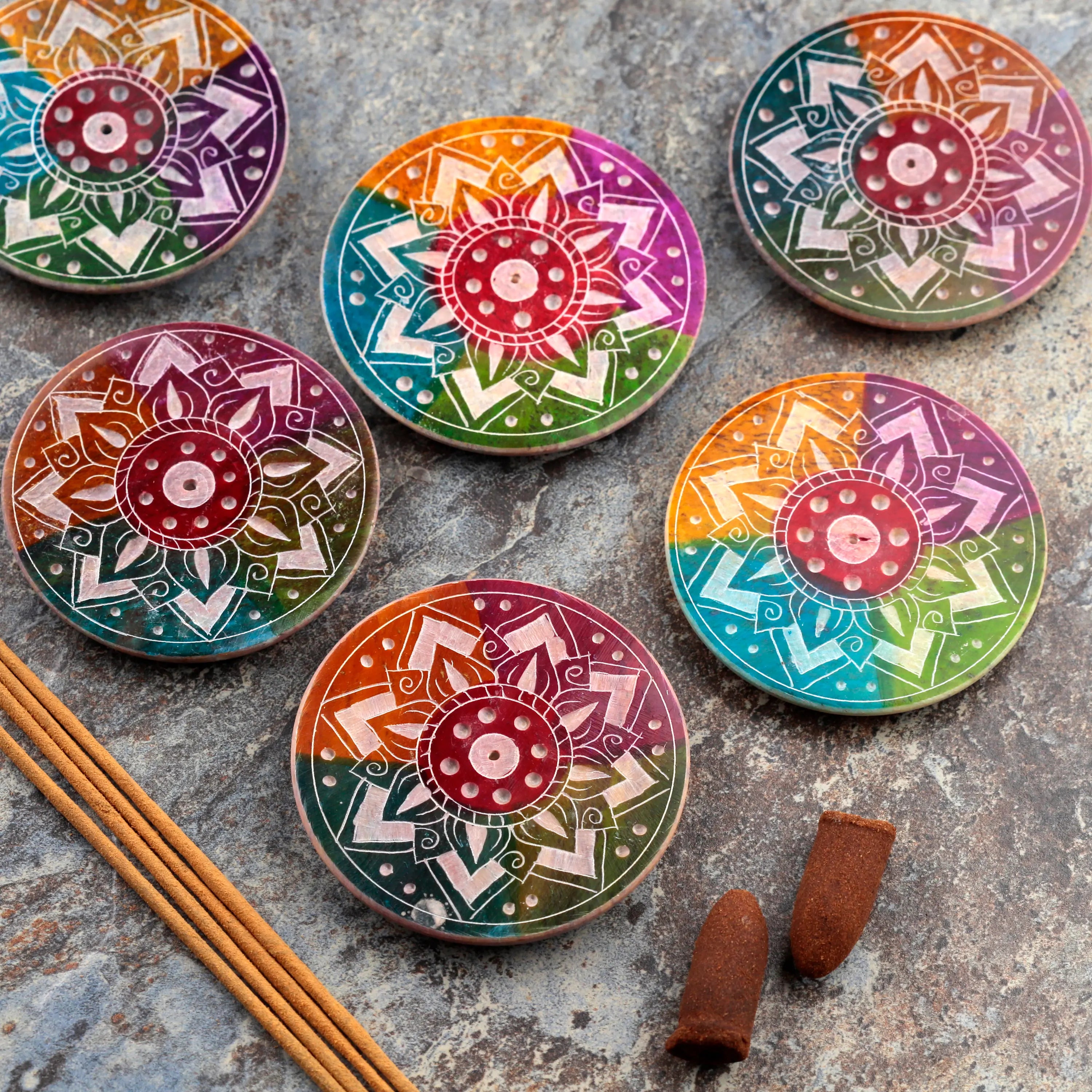 Artisan Craftsmanship: Discover the unique charm of this incense dish, meticulously carved from soapstone to feature a stunning sunburst design. Each piece boasts a rainbow colour gradient or a rich mix of reddish-brown, dark green, and purple hues, with intricate white carved patterns that ensure every burner is a one-of-a-kind work of art. Please note that due to the natural material, the pattern, tone, and colour intensity will vary, adding to its individual character.
